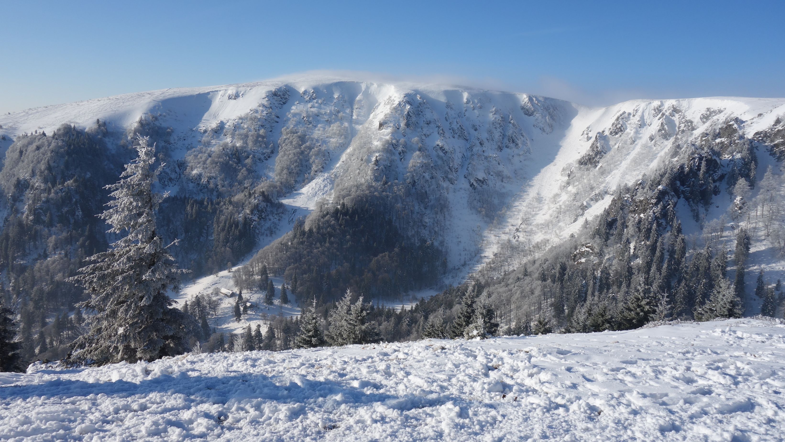 De hemel is volledig uitgeklaard. Al ligt de temperatuur onder het vriespunt, het is wel zonnig en het uitzicht is prachtig. We kijken uit over het keteldal van het Frankental, de Martinswand en de Hohneck.