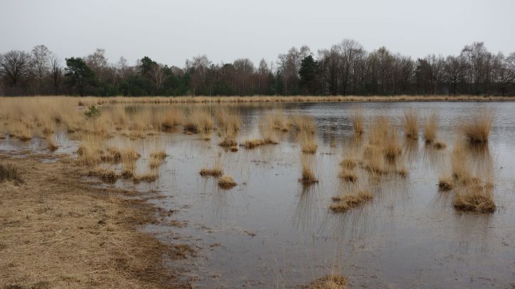De witgeverfde Rovertkapel kondigt de grens met Nederland aan. We steken de Rovertse Leije over en schakelen over op het Grenslandpad. Links van ons ligt een uitgestrekt heidegebied, rechts van ons is een tractor aan het ploegen. Na twee kilometer over een kaarsrecht karrespoor, zijn we blij dat de witrode tekens van richting veranderen en verlost zijn van de koude wind. De veenplas van Papschot ligt er prachtig bij.