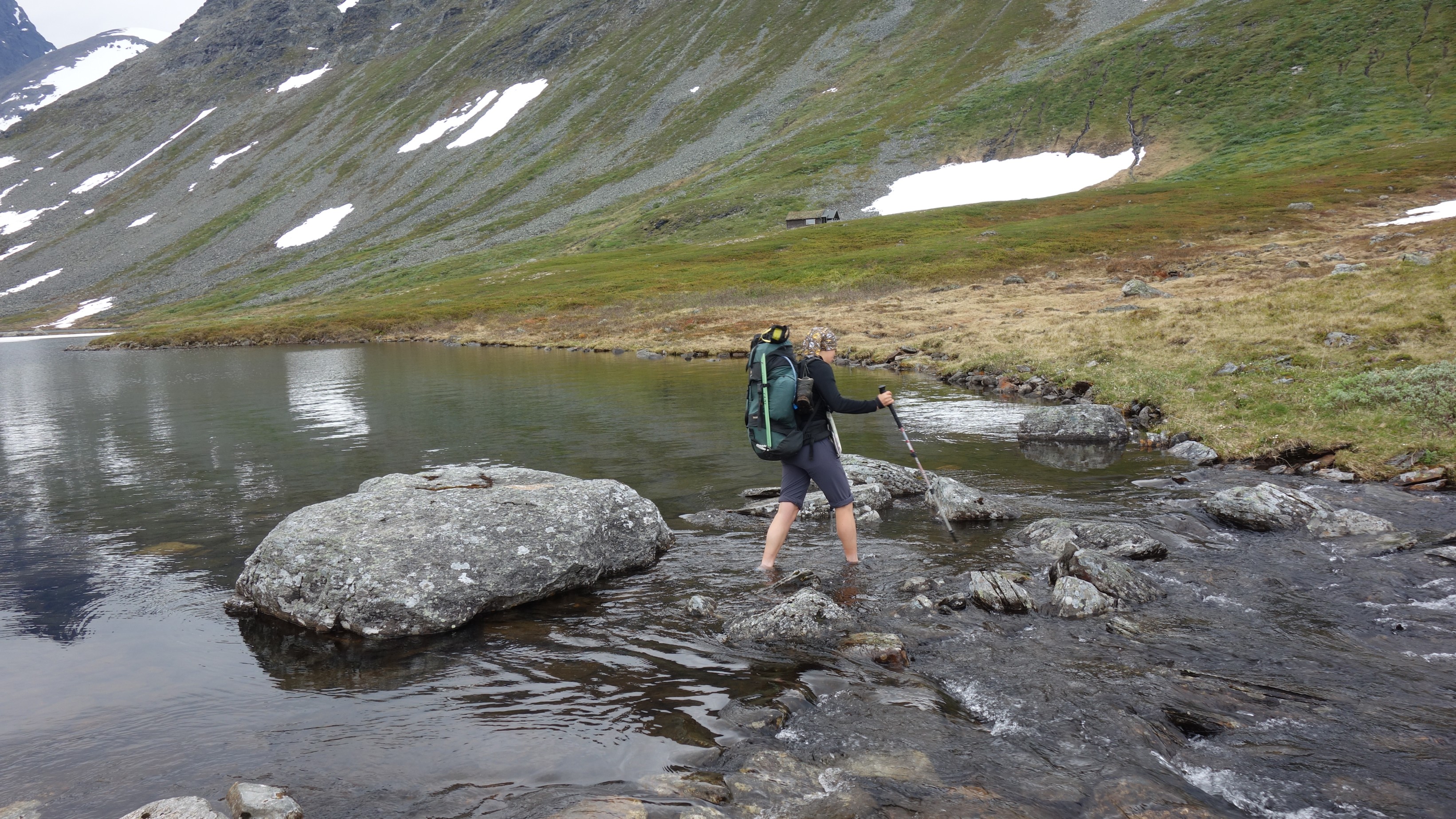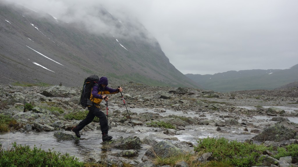 Regen en droge periodes wisselen elkaar vandaag af, best handig gezien er ons 4 doorwadingen te wachten staan. De Lyngen på vermijdt de autoweg en volgt de westzijde van het massief. Na een klim naar het zadel Botnfjellet dalen we af naar Veidalen.