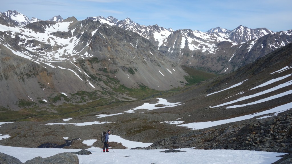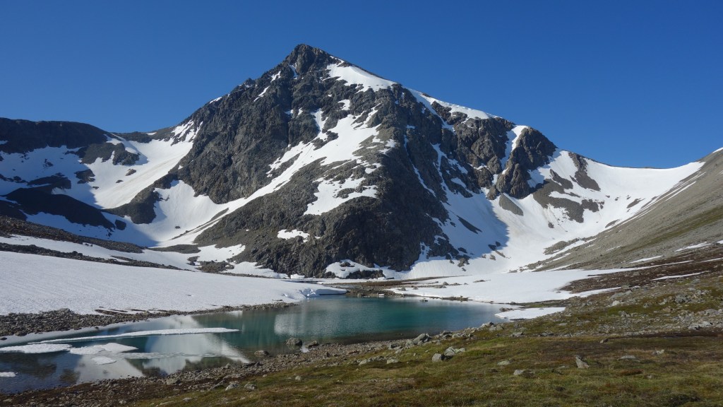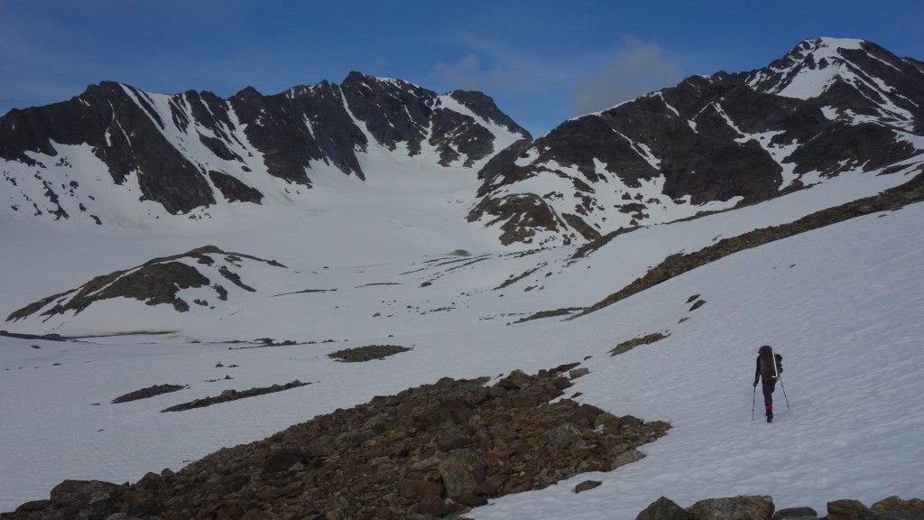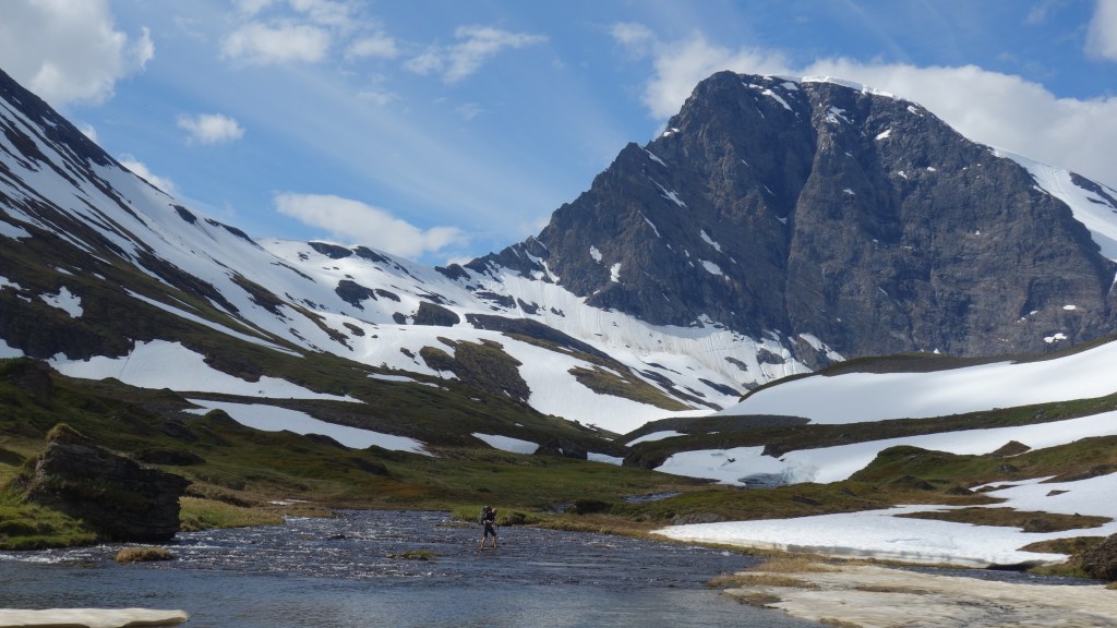Als we de afdaling naar Ellendalen zien, krabben we eens in het haar. Het sneeuwveld aan de noordzijde lijkt in een afgrond te eindigen. Ivo’s lef is wat groter dan dat van mij, en hij trekt een spoor door de sneeuw. Na een etappe van 11u is het vet van de soep. Het is helaas nog even zoeken naar een geschikte bivakplek in dit ruwe terrein. Gelukkig geen muggen vanavond.