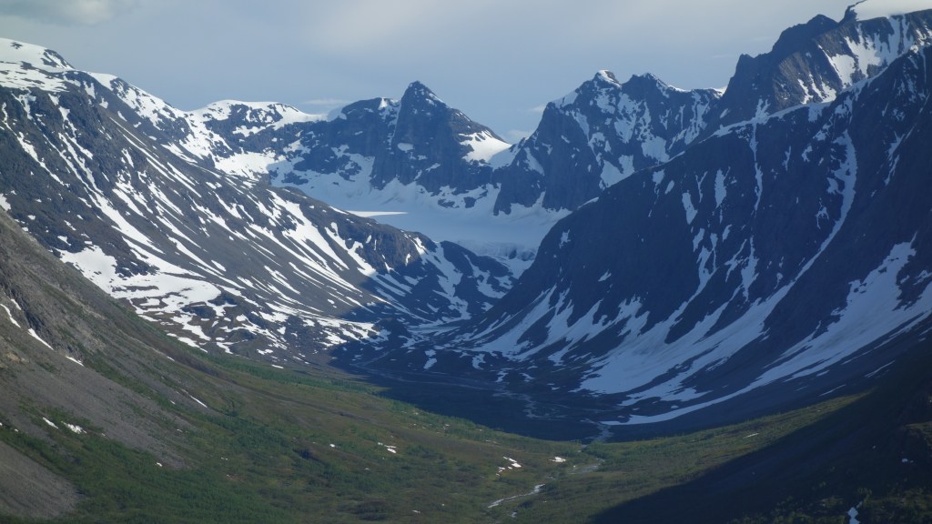 Nabij Gurgela wordt het terrein wat rotsiger en duiken ook de eerste sneeuwvelden op. Dat loopt vlotter. Dreigende wolken komen over de Storvaststinden opzetten maar houden zich voorlopig koest. Onze eerste doorwading is een rustige opwarming voor wat ons de volgende dagen nog te wachten staat.