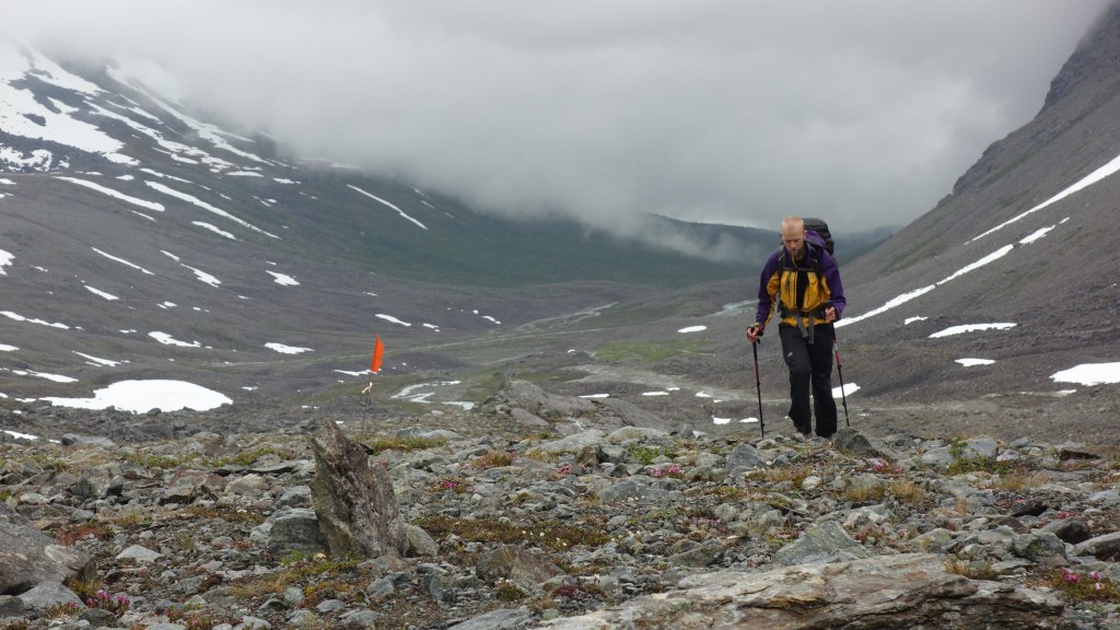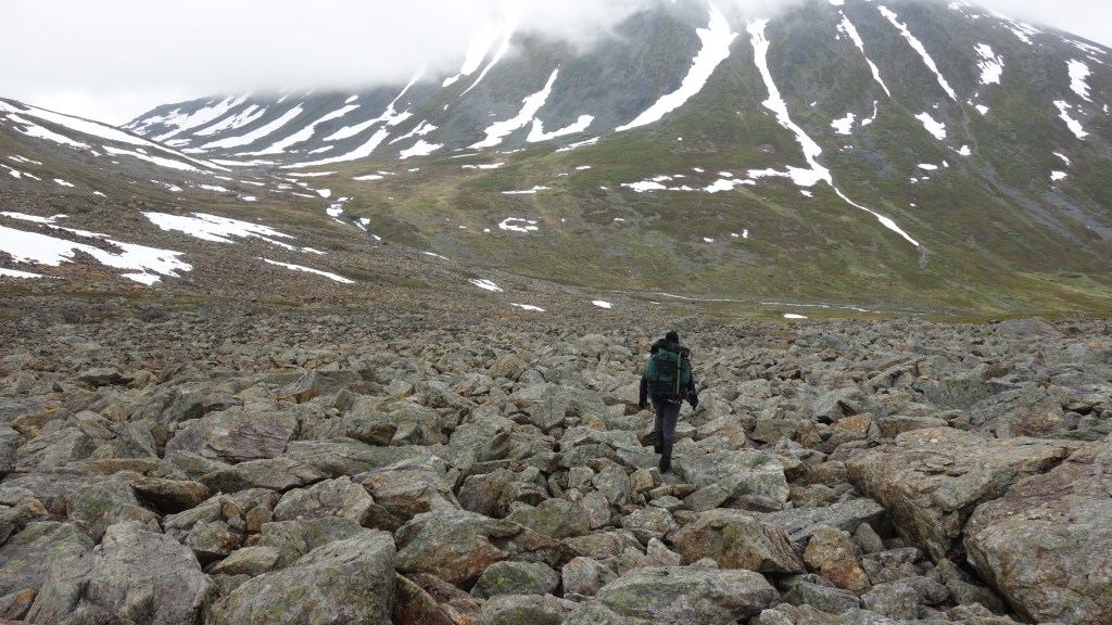 De doorsteek naar Langdalen belooft alvast veel goeds, tot we de bergflank beginnen te dwarsen om een zadel genaamd Ganešoalgi te bereiken. Het traverseren van het oneffen terrein vergt heel wat energie.