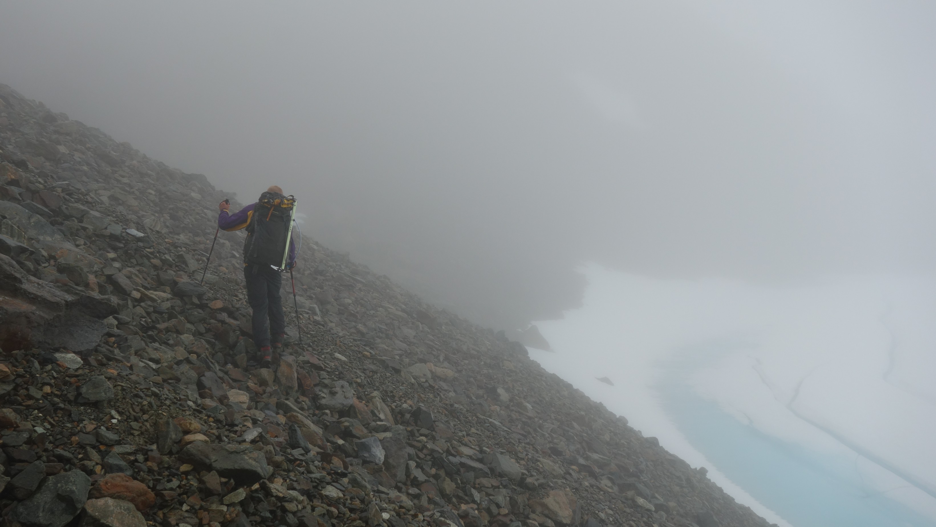 Le nouveau temps est arrivé. Het wordt een grijze dag vandaag maar voorlopig zitten enkel de hoogste toppen in de wolken. In het dal vinden we zowaar markering terug totdat de laatste klim ingezet wordt naar een naamloze col; het hele dal kleurt wit. We gespen de stijgijzers aan en zien het wolkendek alsmaar zakken. Voor we het beseffen zitten we in een white-out en is ons oriëntatiegevoel totaal onbetrouwbaar geworden. Via de GPS achterhalen we dat we een eind van de route aan het afwijken zijn.