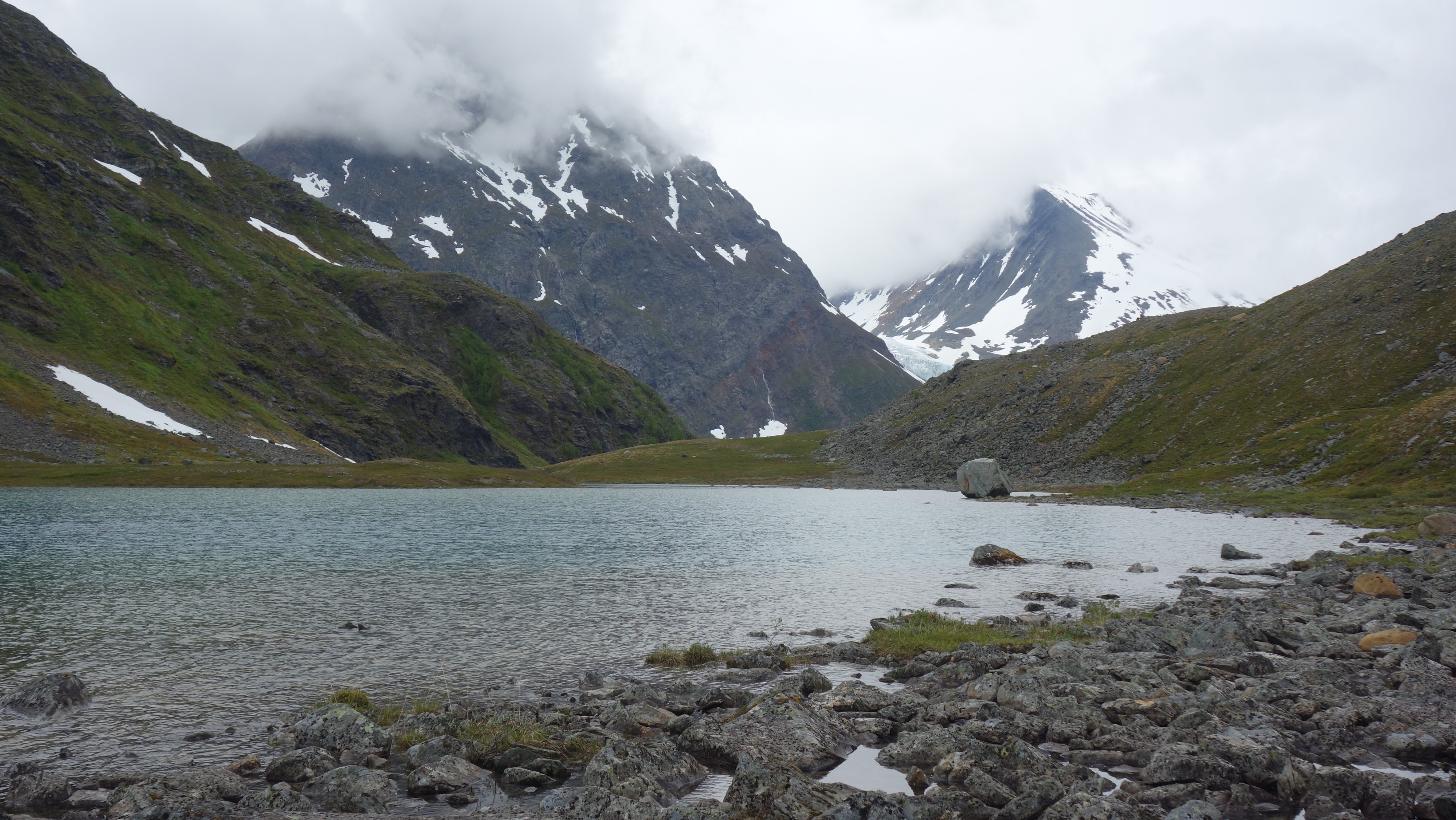 In de hoop dat de mist alsnog optrekt, besluiten we wat uit te slapen en verder te recupereren van enkele stevige etappes. Rond de middag is er helaas nog geen verbetering te zien, dus kramen we op en dalen verder via het Veidalen af in noordelijke richting. Terug onder het wolkendek krijgen we zicht op de vallei waar een meanderende rivier het smeltwater van 3 gletsjers afvoert…en die we ook nog zullen mogen doorwaden.