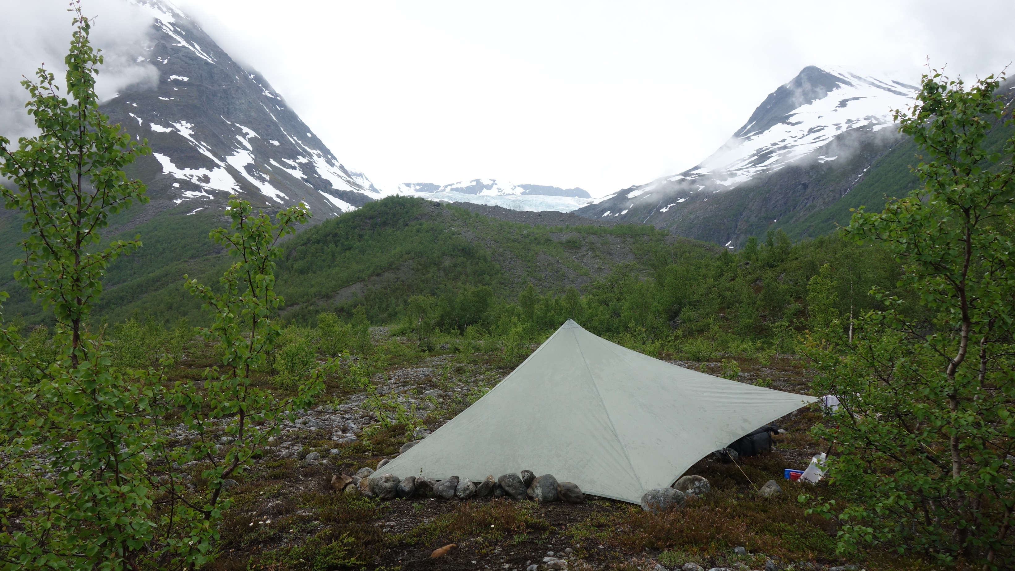 Vanaf de col dalen we af naar Fastdalen waar we twijfelen om al dan niet ver te gaan. Om de opties open te laten, slaan we onze bivak op aan de kruising met Russedalen.