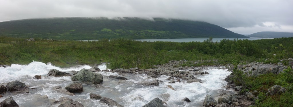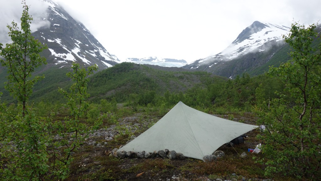 Een mooi bivakplek aan de rivier laten we links liggen, maar als hogerop de eerste druppels vallen nog voor we Lomvatnet bereiken, is het besluit snel genomen. De tarp staat net recht als de hemelsluizen wagenwijd open gaan.
