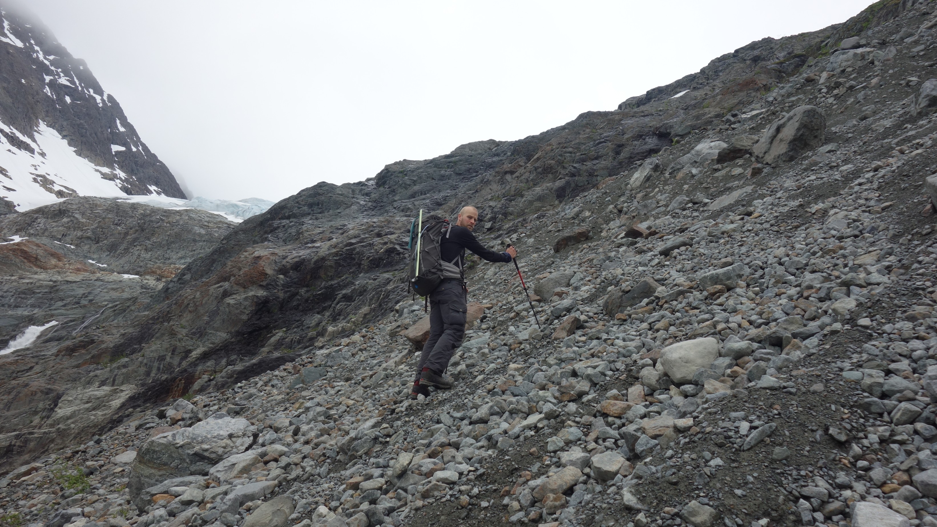 Het pad loopt verder omhoog richting Vestbreen. Bij Jieshkkeskohppi taxeren we de steile bergflank die toegang biedt tot het Bredalen. Het is over steile rotsen klimmen of door couloirs van los puin kruipen. De bedenkelijke keuze valt op het laatste. Het blijkt alweer net doenbaar, al kost het wel krachten. Je hebt maar beter een paar stevige quadriceps.