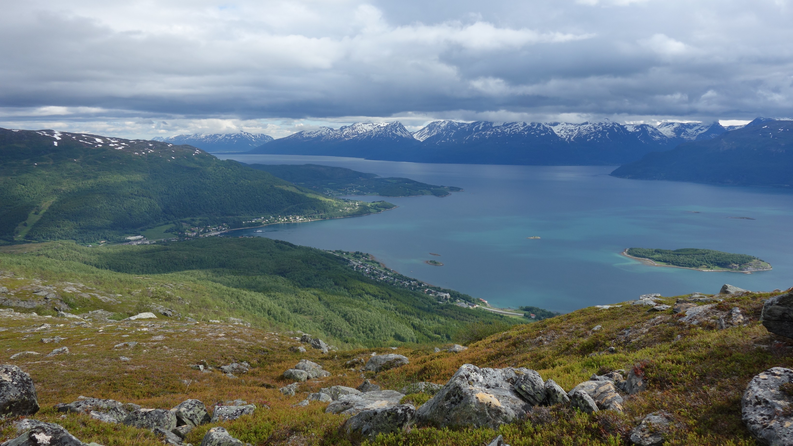 Een koude noorderwind blaast over de heide, maar het weer is aan de beterhand. De zon begint af en toe door het dikke wolkendek te priemen. Een mooie timing. We hebben quasi voortdurend zicht op de Lyngenfjord.