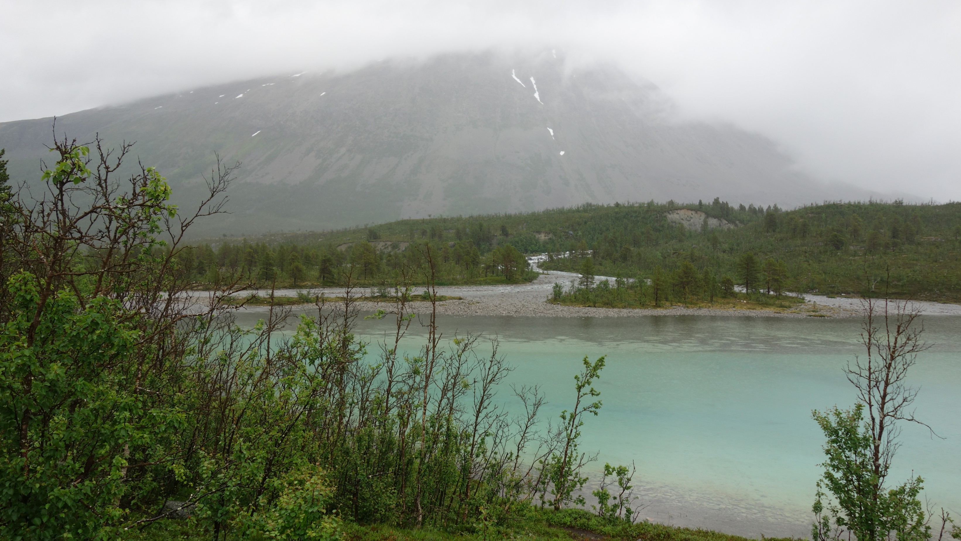 Vooraleer dat het geval is, volgt eerst nog een bijzondere natte afdaling door een berkenbos met gladde rotsblokken en natte bosbessenstruikjes. Zelf met regenjas en –broek is het vocht niet buiten te houden. De schoenen hebben het al enkele dagen geleden opgegeven, van de waxbeurt thuis is niets meer te merken.