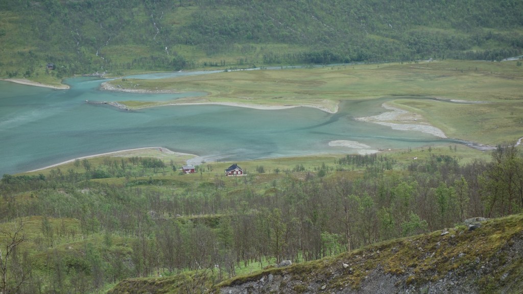 Langs de Jægervatnet vinden we een smal wandelspoor. Een koude wind blaast over het meer, de omstandigheden zijn best guur. Bij de monding van de Forholtelva vinden een mooi bivakplek nabij een aanlegplaats voor een bijzonder riante maar smaakloze chalet bovenop de heuvel. De eigenaars zijn helaas niet thuis en kunnen ons dus geen warme chocomelk aanbieden, jammer.