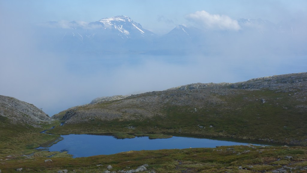 Met nog 2 dagen op overschot, doen we er nog een lusje bij en klimmen naar het plateau ten zuidoosten van de vuurtoren. De eerste uren zitten we nog in de mist, maar langzaamaan breekt de zon door. De Lyngenfjord komt tevoorschijn.