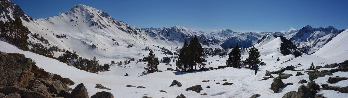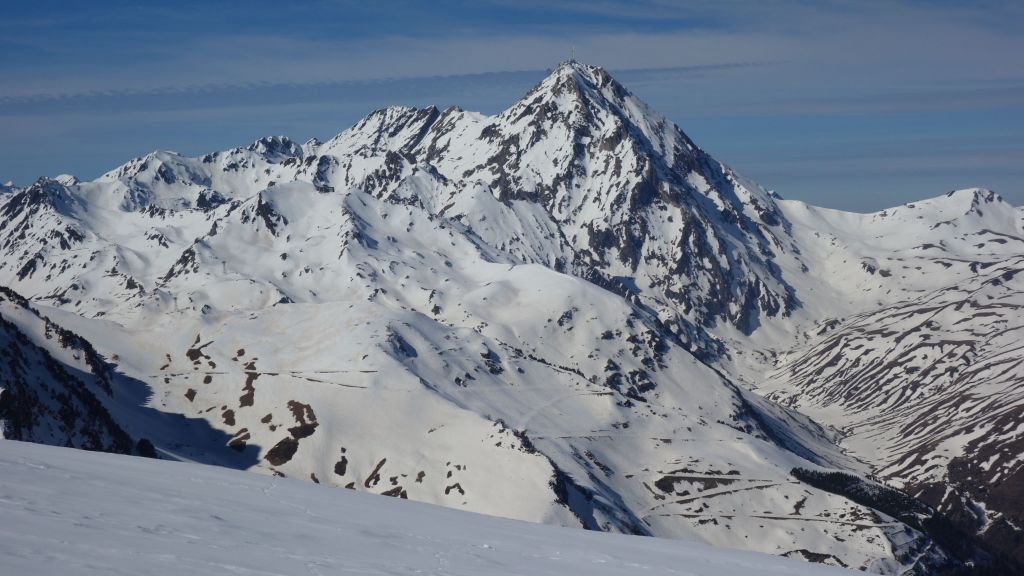 Al op de kam hebben we een erg mooi zicht maar het summum ligt nog wat hoger. Na een wat steilere traversée vlakt het terrein uit. Het uitzicht over de besneeuwde toppen van de centrale Pyreneeën is prachtig. Ook de Brèche de Roland toont zich, de befaamde rotskloof op de grens tussen Frankrijk en Spanje die bereikbaar is vanaf Gavarnie.