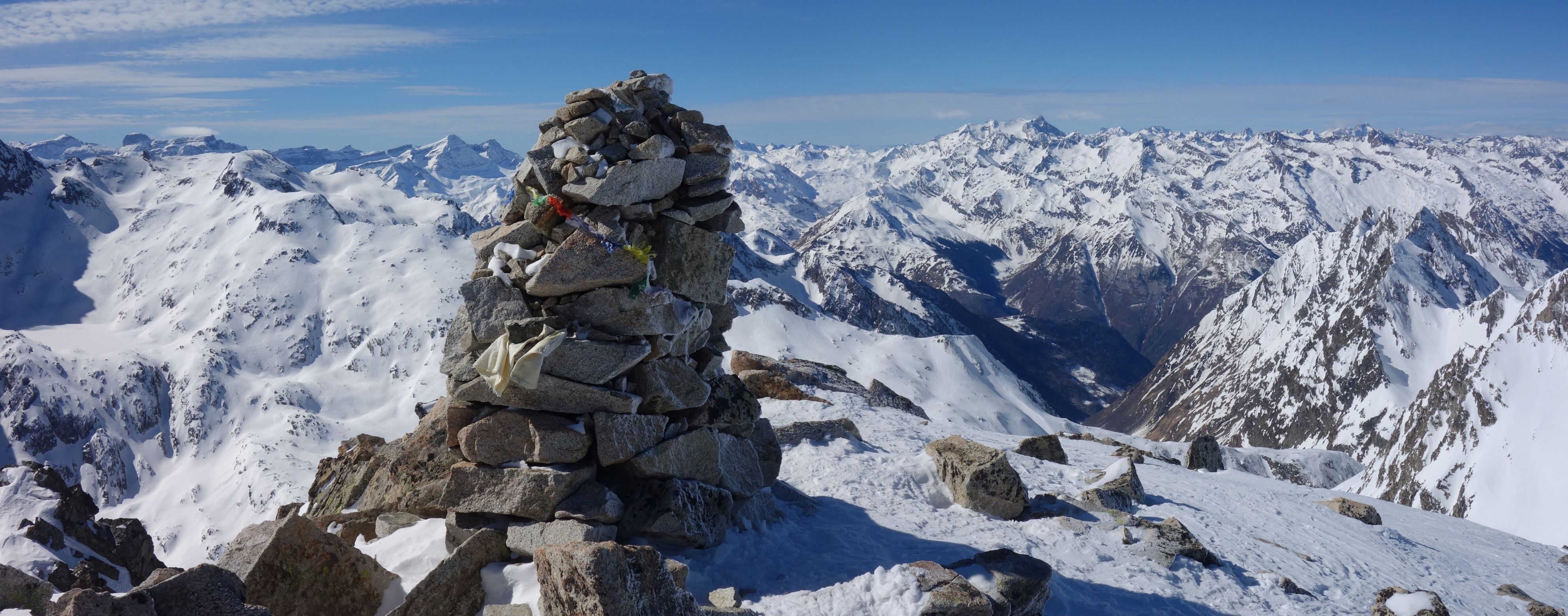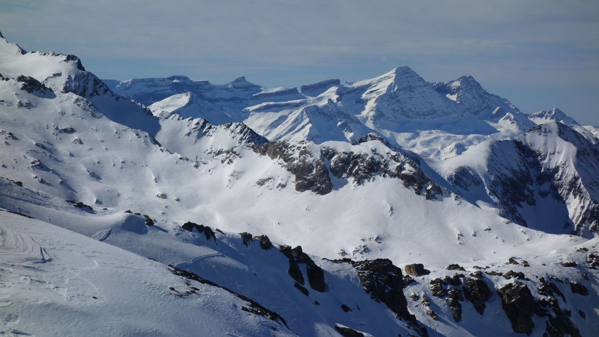 Maar we klagen niet, het zicht is meer dan behoorlijk. Va de oostzijde dalen we af in maagdelijk witte sneeuw. Door de warme temperaturen krijgt het sneeuwdek het steeds lastiger om ons te dragen. Plakken natte sneeuw kleven onderaan de raketten, af en toe worden ze er in ‘castagnette-stijl’ afgeschud.