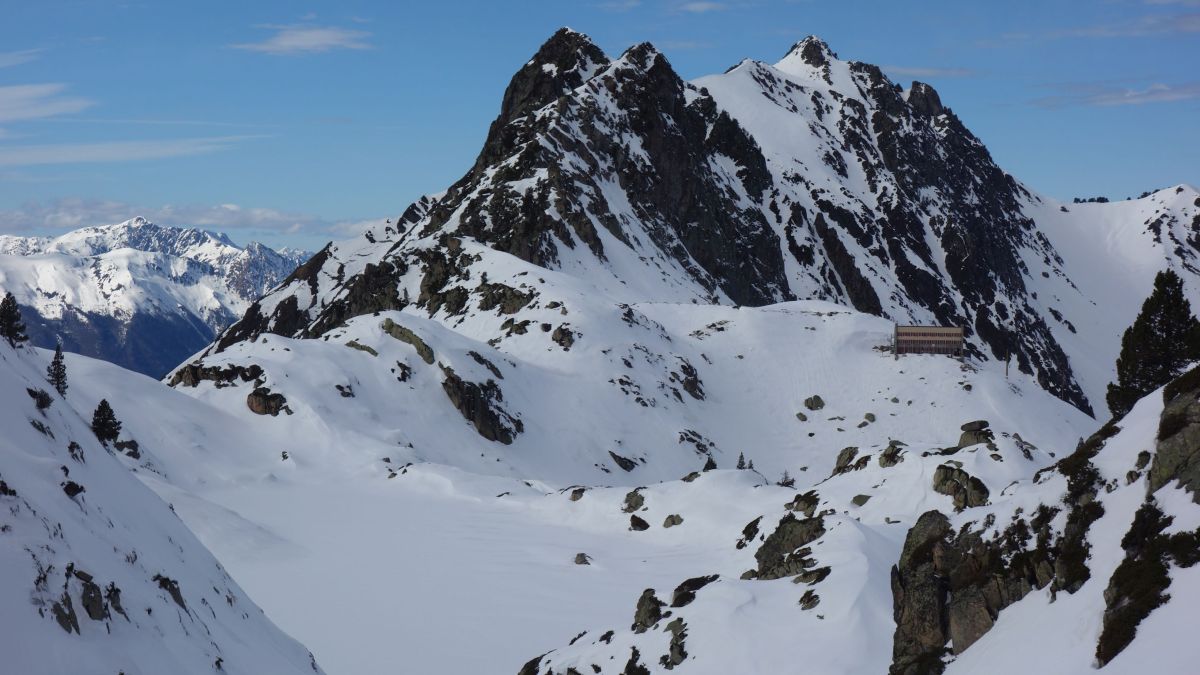 We steken het bevroren meer over en bereiken daarna snel de hut. De sneeuw ligt vrij hoog aangewaaid tegen de voordeur, en het lijkt erop dat nog niemand hier in de winter geslapen heeft. De zuidflank van de col is steil en nodigt zeker niet uit om af te dalen.