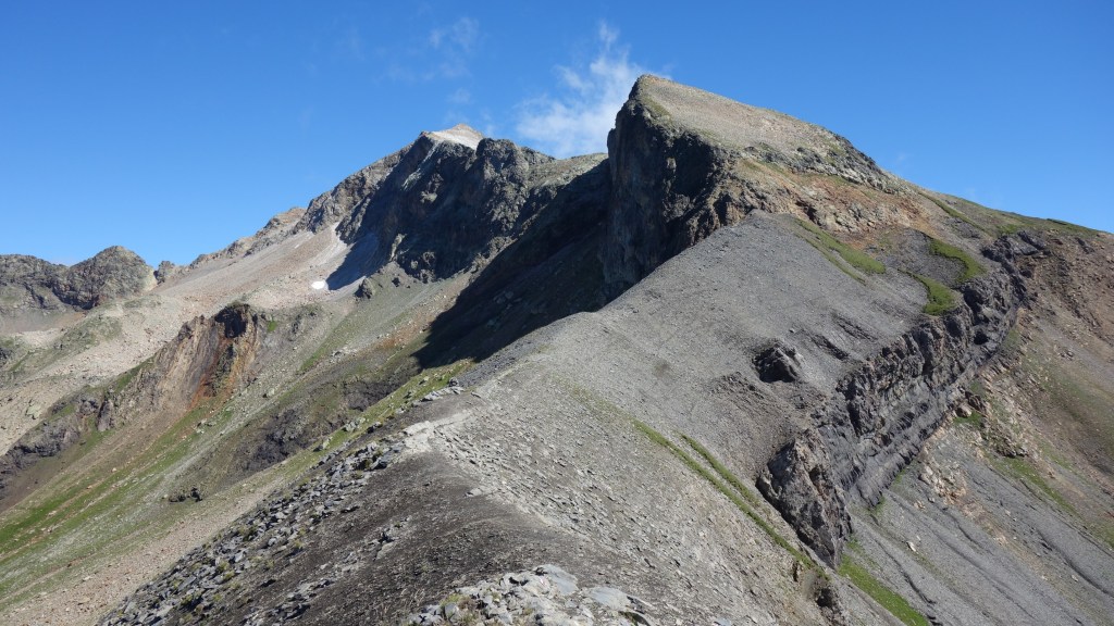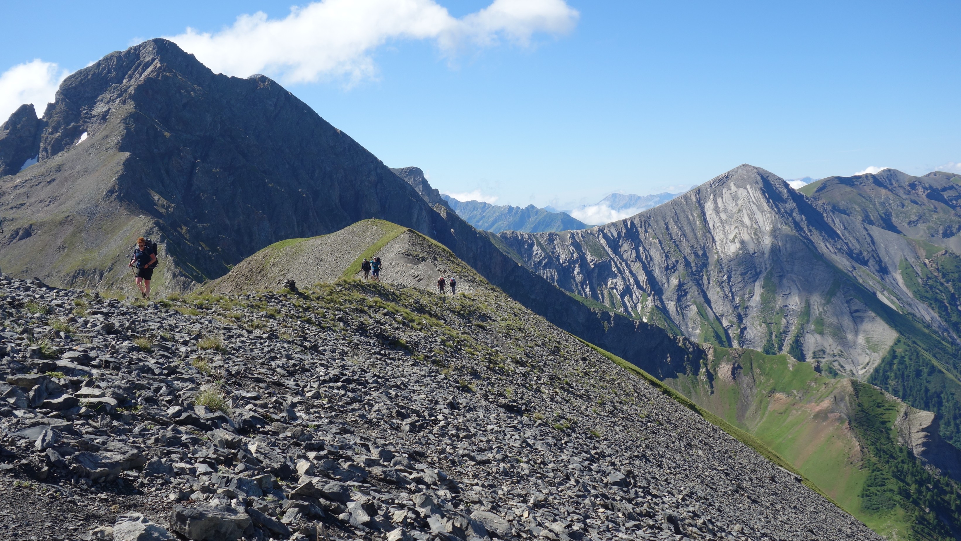 De zon werpt de eerste stralen op de tarp, het wordt meteen aangenaam warm. Na het ontbijt trekken we gestaag omhoog naar de Crête de la Montagne. We laten de rugzak achter om nog een tikkeltje hoger te trekken richting Pointe de Confolens tot het terrein te technisch wordt.