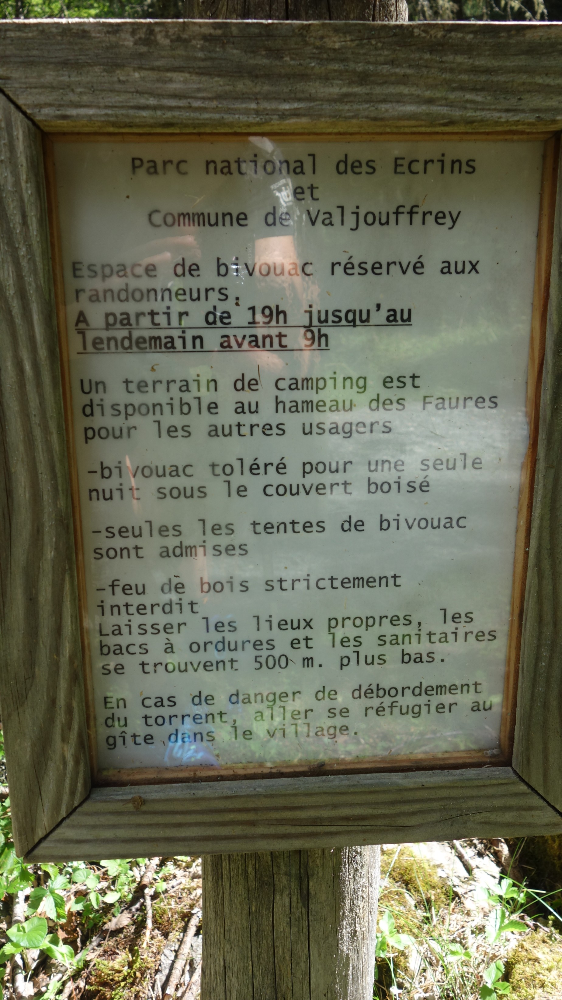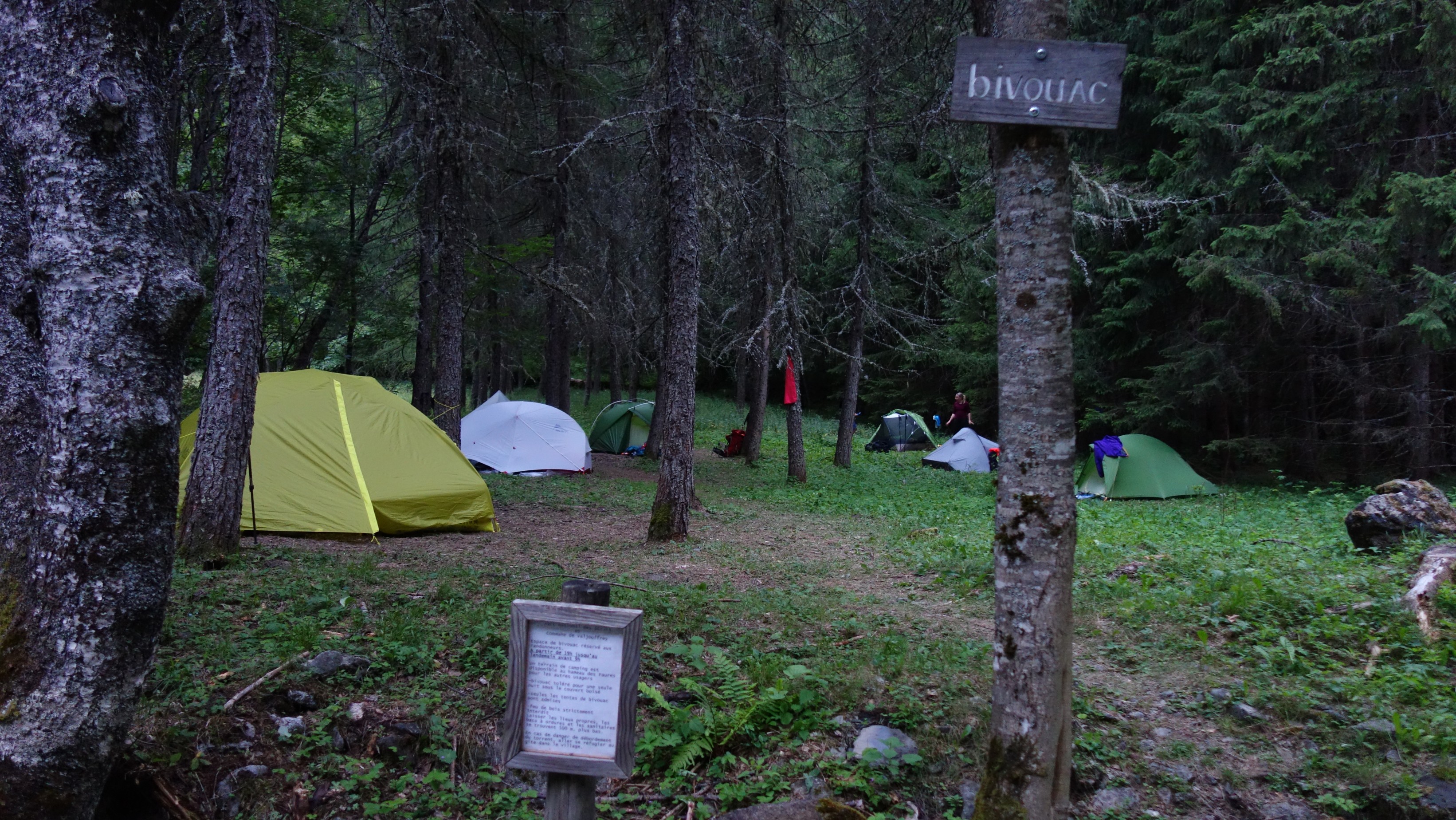 Op deze tocht is bivakkeren heel makkelijk en toegelaten, soms kan je vrij kiezen waar je staat, soms zijn er bivakzones vb. bij Valsenestre en Refuge de la Muzelle. Wie binnen wil slapen, zal een andere route moeten volgen vb. de originele route van de GR54 want de eerste 3 dagen (die te combineren zijn in 2) is er geen accommodatie. Je kan bijvoorbeeld wel van la Danchère naar Refuge da Muzelle en de volgende dag naar Valsenestre en zo verder zuidwaarts.