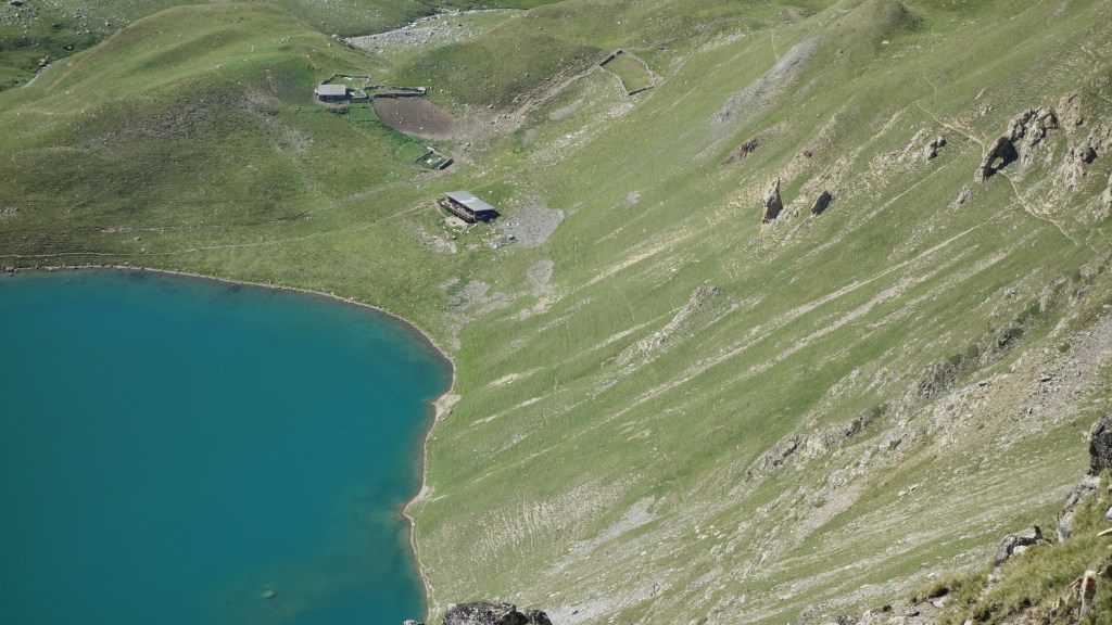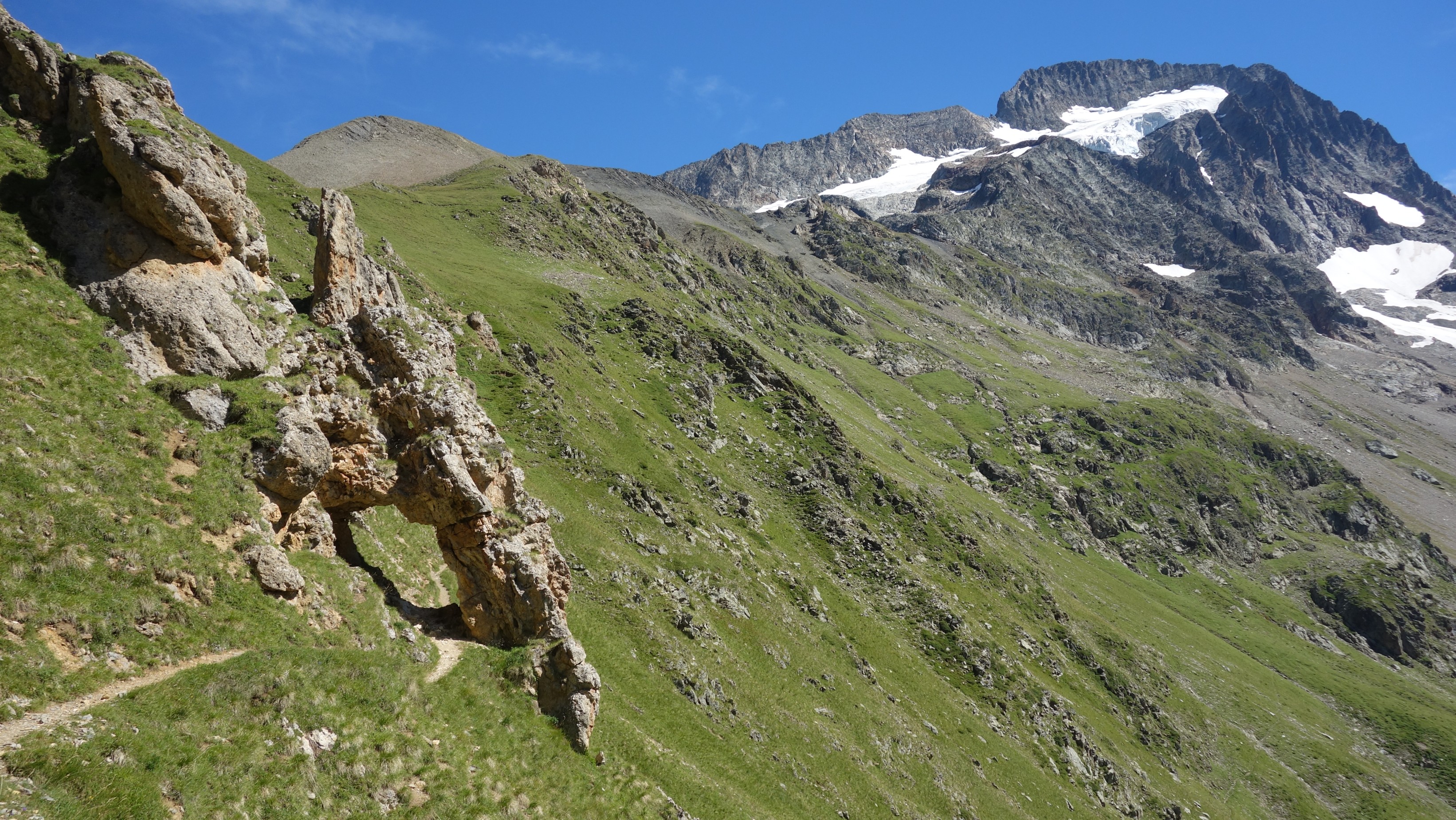 Via een grintpad gaat het terug omlaag richting Cabane de la Selle. Op de almweide strijken we neer voor de lunch. Een mooi pad leidt ons tussen frisgroene lorken naar Rocher de la Grande Eglise. De omgeving is werkelijk schitterend, terwijl het hier opvallend rustig wandelen is, en dat temidden het hoogseizoen.