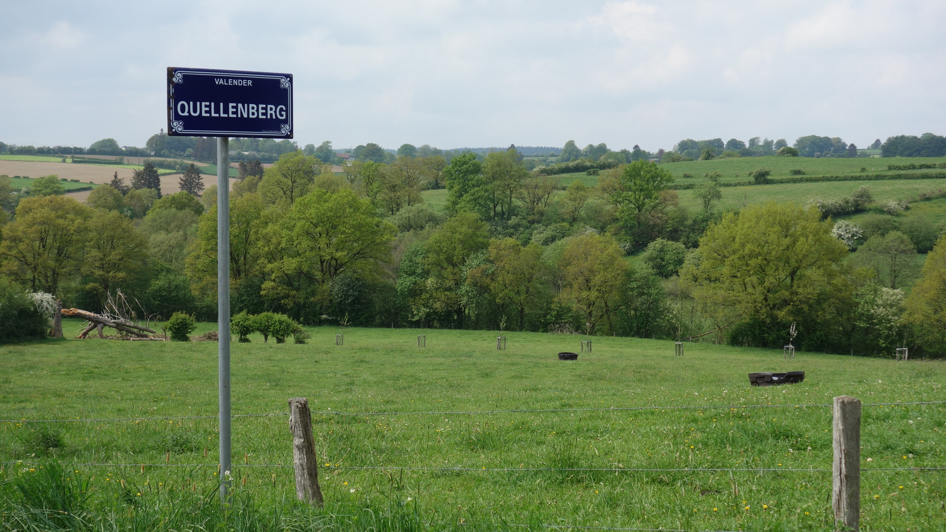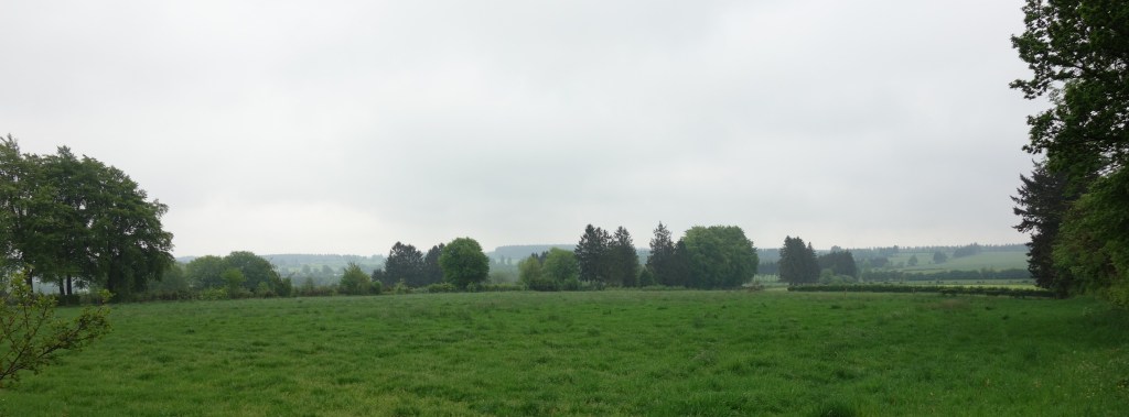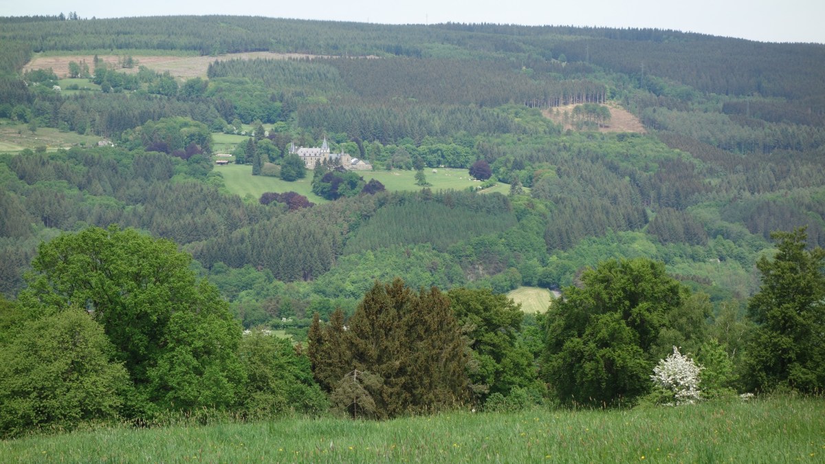 Na het bijtanken van wat water bij de bron bovenop de heuvel, steken we door richting Stoumont via wat eigenlijk een privéweg is, maar aantrekkelijker dan de GR. Op een weide strijken we neer voor de lunch. Het panorama op het kasteel van Froidcour in de machtige Amblève-vallei is zonder meer indrukwekkend. Het beste zicht van deze vierdaagse.