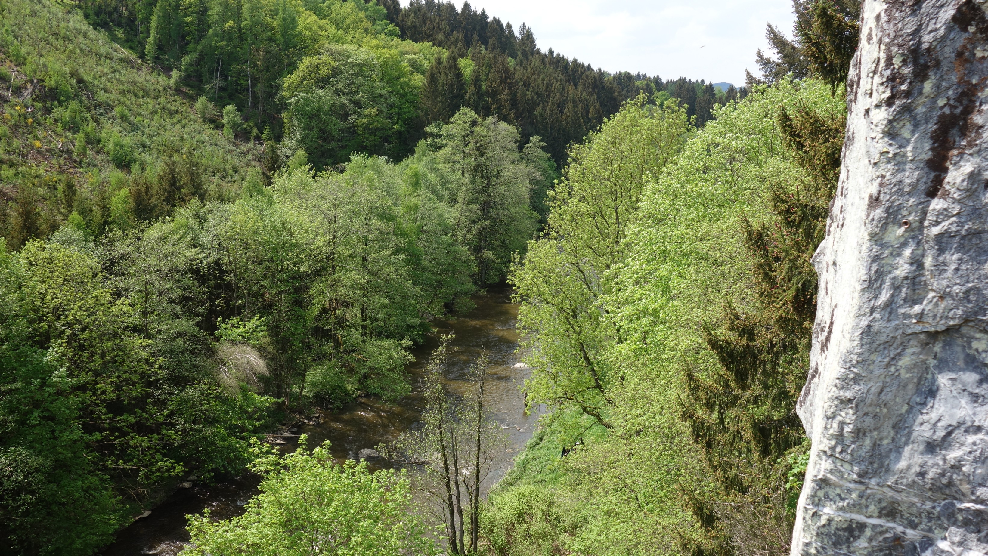 We trekken verder naar de monding van de Warche in de Amblève, deze rivier komt van het veenplateau en heeft daar een diep V-dal ingesneden. Het gaat onder de autosnelweg door. Wat verder vinden we de Rocher de Warche, waar je bovenop een prachtig zicht hebt op de vallei.