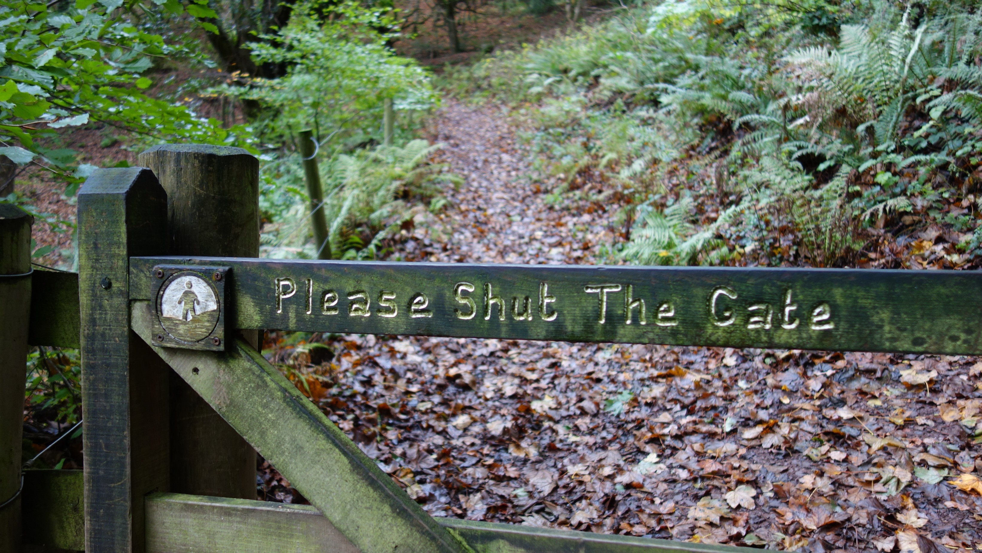 Het gaat al snel bergop door een loofbos. Bij elk houten poortje krijgen we de boodschap ‘Please shut the gate’. De varens die buiten het woud staan kleuren roest, in het bos zijn ze in staat langer groen te blijven. De impact van de elementen is niet te onderschatten, maar vandaag staat er enkel een rustig zeebriesje.
