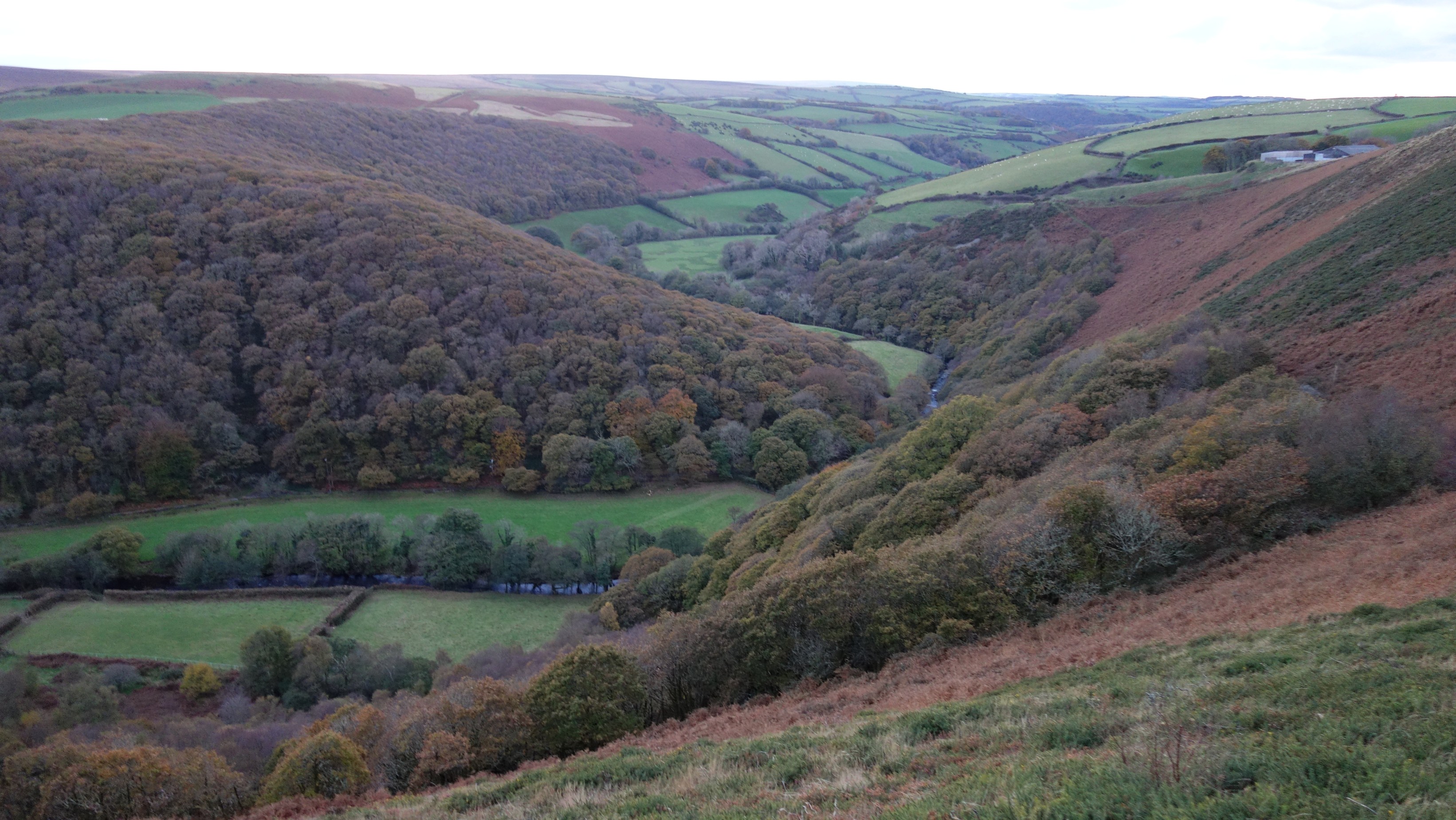 Nabij Sugerloaf Hill laten we het SWCP rechts liggen en gaan het binnenland in. Als we de autoweg oversteken begint het al te schemeren. We zijn nog net op tijd om van het prachtige zicht op de vallei van de Lynn te genieten. Een mooi pad leidt ons naar Bryndon.