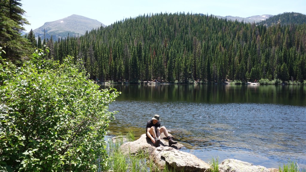 Hoewel het onze eerste inloopdag is, verkies ik toch de meest ‘scenic’ route naar Boulder Brook. Dat betekent extra kilometers en hoogtemeters maar we genieten wel volop van de uitzichten. In Bear Lake geven we de verhitte voeten wat verfrissing, de temperatuur loopt toch vlotjes tot 25° en hoger op. Het is hier razend druk gezien een parking vlakbij ligt. Na Dream Lake is de rust terug en komen we nog slechts een handvol hikers tegen, maar het is dan ook al laat en niet alleen de dag, maar ook onze benen beginnen op hun einde te lopen.
