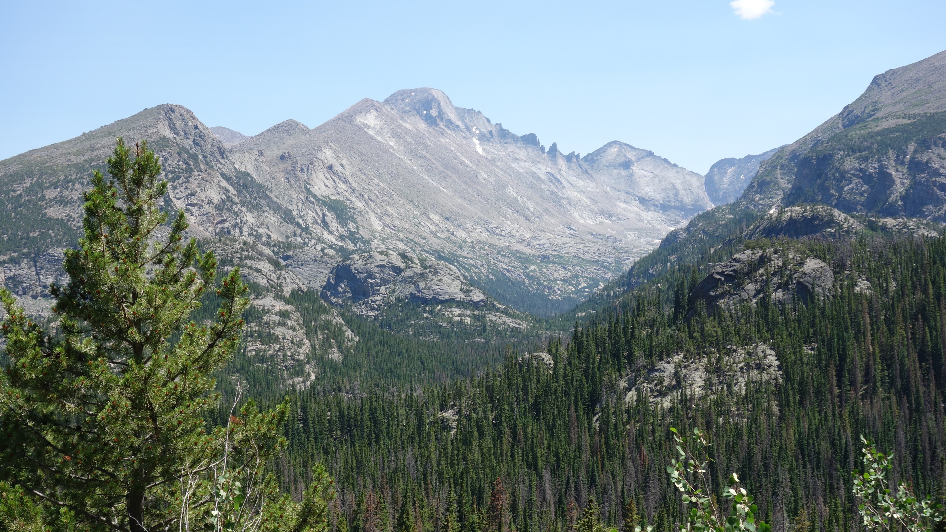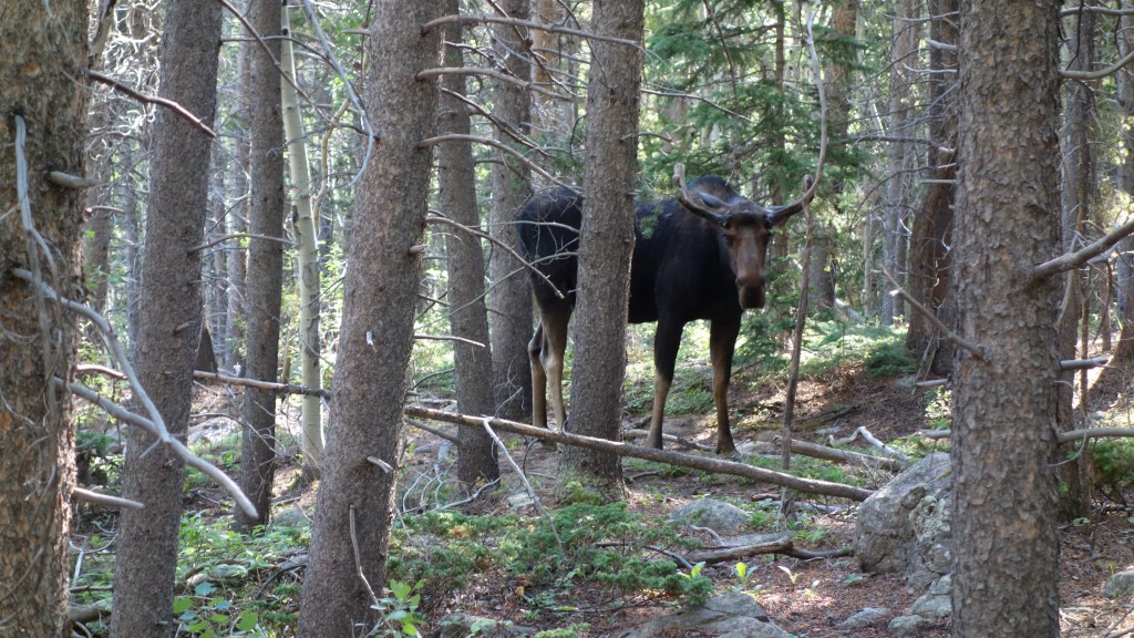 In optimale condities zou een klim naar Long Peaks, die met zijn 4.346 m de hoogste top van RMNP is, een heel stevige maar naar onze normen logische keuze geweest zijn. Vanaf deze bivaklocatie kan je hem immers met een lichte rugzak beklimmen. Maar aangezien we nog altijd in onzekerheid leven over het lot van Ivo’s rugzak, willen we tijdig afdalen, voor het geval we terug naar de luchthaven mogen reizen om hem te gaan ophalen. Het pad dat verder het riviertje stroomafwaarts volgt, is heel aangenaam en we spotten – na een geanimeerde waarschuwing van een collega-hiker – onze eerste ‘moose’. De mannelijke eland is met 2m hoogte geen doetje maar wij zijn dat wel dus blijven we op een veilige afstand.