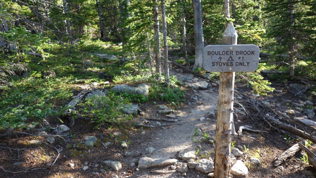 Boulder Brook mag je niet verwarren met Boulder Crook (‘oplichter’), zo niet zullen je tegenliggers bijzonder raar opkijken als je dit benoemt als je bestemming van de dag… Bon, het zijn dus twee aparte bivakplaatsen die telkens met een pad bereikbaar zijn. We kiezen er de mooiste uit – een luxe gezien ze allebei nog niet bezet zijn – en installeren ons op deze heel rustige bivakzone. Wat verder stroomt een bulderend bergriviertje, waar we ook gaan eten zodat onze etensgeur weg van de tent blijft, nu we nog vol goede voornemens zijn. Onze bear canister wordt ergens 50m verder verstopt onder een markante boom, kwestie van die ook nog terug te kunnen vinden de volgende ochtend. De slaap komt heel vlotjes na zo’n pittige inloopdag, zelfs in ‘bear country’.