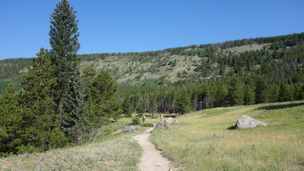 Hoog boven ons turen de mastodonten van de Front Range, voorlopig nog mentaal onbereikbaar maar daar zal binnen enkele dagen verandering in komen. De paden zijn perfect beloopbaar, wegwijzers op elke splitsing aangebracht. Hier geen liters verf die om de zoveel meter op een steen geschilderd is, maar je kan dan ook amper verkeerd lopen.