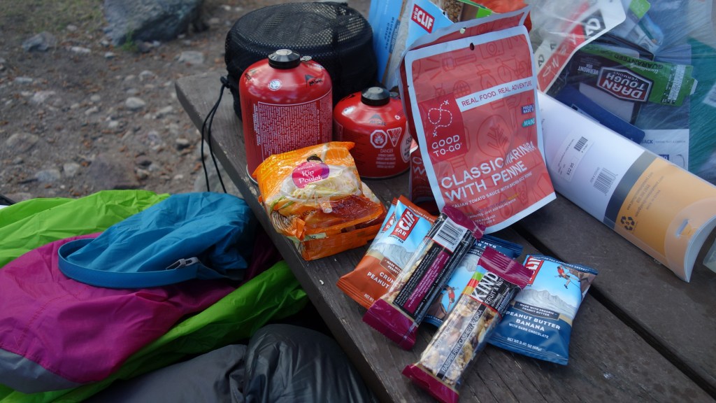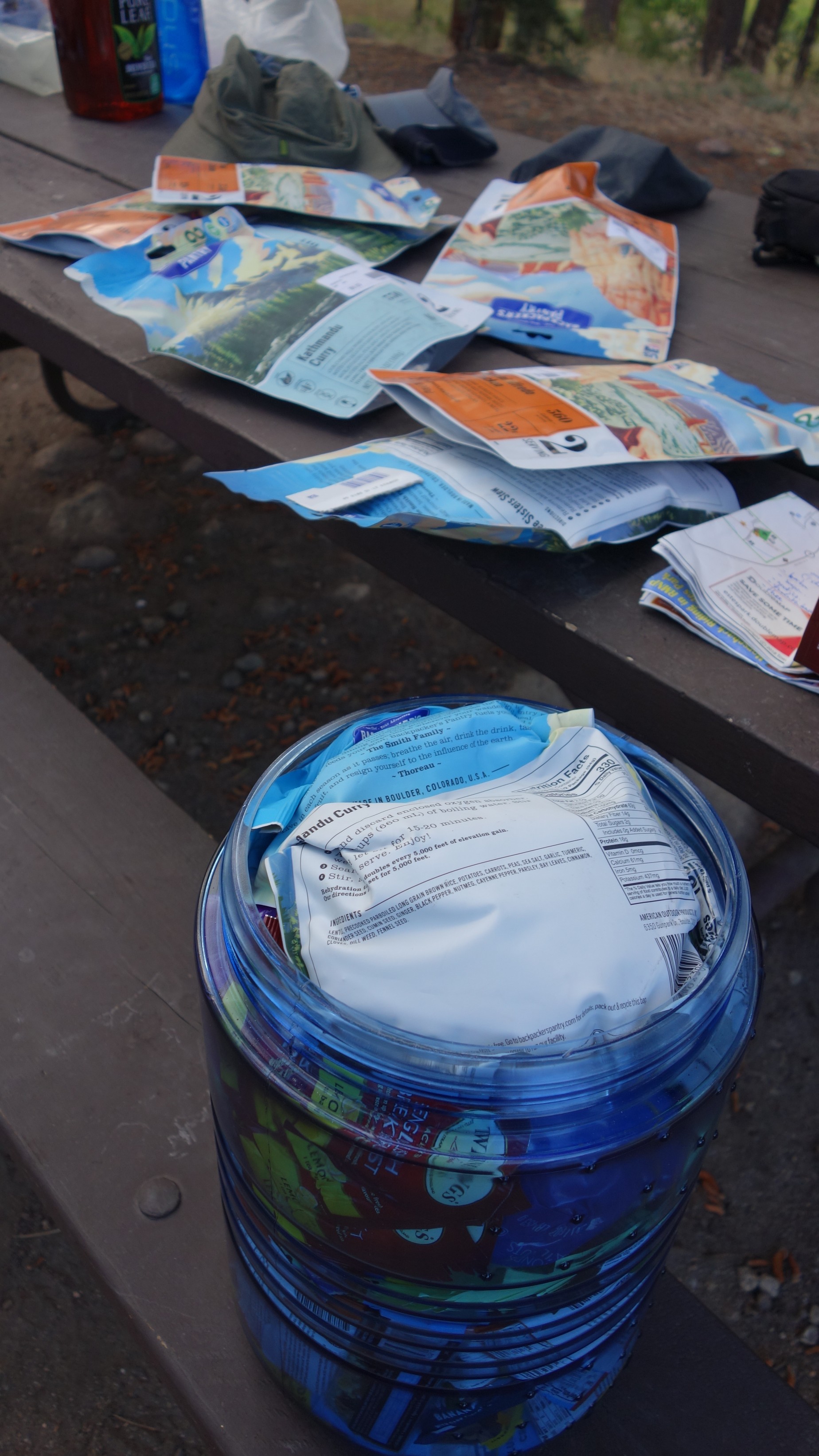 Er is géén enkele bevoorrading mogelijk langs of vlakbij de route, ook niet in Moraine Park Campground. Water vind je wel in overvloed. In Estes Park kochten we onze energierepen (vb. Cliffbar), noodles, soep, nootjes en dergelijke in de lokale hypermarkt ‘Safeway’ (waarbij we overigens de klantencode van een baliemedewerker van het Visitor Center mochten gebruikten want dat levert extra korting op en ja, dat hebben ze ons dus ter plaatse gewoon verteld). In Estes Park Mountain Shop kochten we gas (van het merk MSR) en diverse vriesdroogmaaltijden. De ‘Good-to-go’-maaltijden zijn wat duurder maar razend lekker. Omwille van de invoerbeperkingen hebben we het er niet op gewaagd om eigen gedroogde voeding mee te nemen in de bagage.