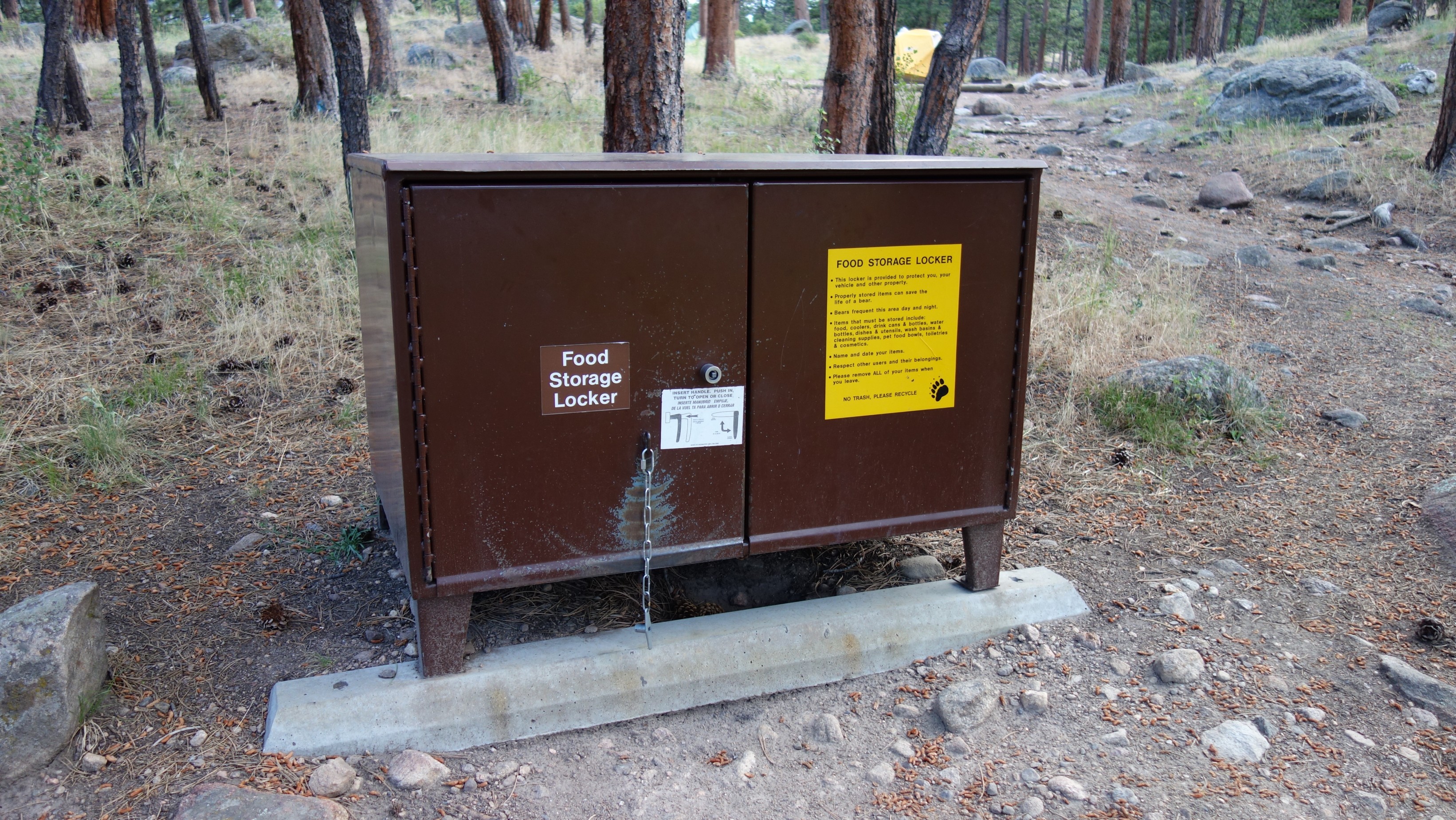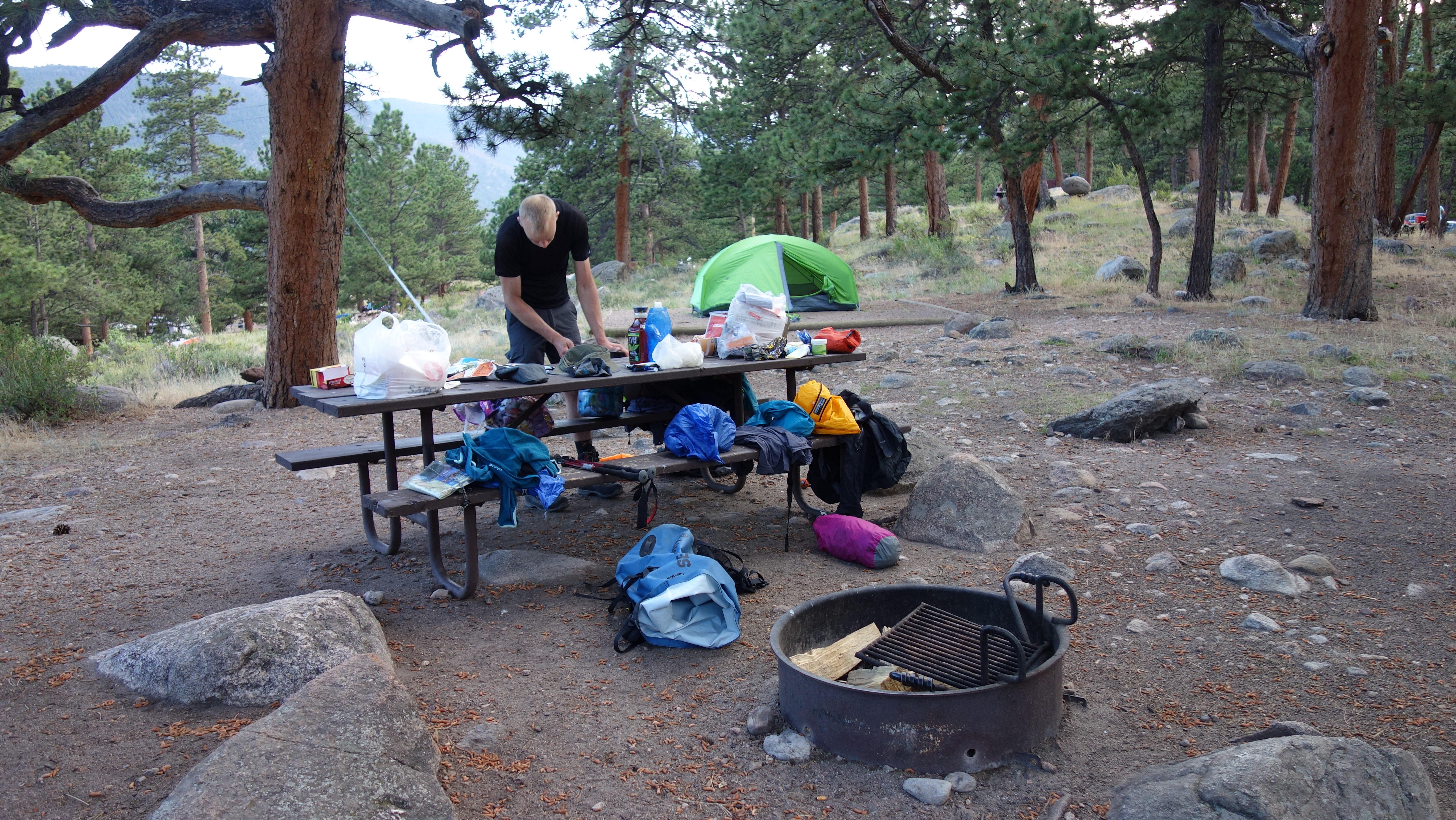 In Moraine Park Campground poten we ons gloednieuwe polyester tentje op onze inmiddels vertrouwde stek neer en start Ivo met een nieuwe uitdaging: twee ruime bear canisters zo maximaal mogelijk vullen met 8 dagen voeding voor 2 personen. Helaas slaagt hij niet helemaal in de opzet en zullen we toch enkele gevriesdroogde maaltijden in de tent moeten bewaren. Hij is er niet helemaal gerust in, maar dat zijn zorgen voor later. Deze nacht zal de bear locker er letterlijk voor zorgen dat onze voorraad niet geplunderd wordt nog vóór we gaan vertrekken op onze eerste van twee langere trektochten in de Rockies.