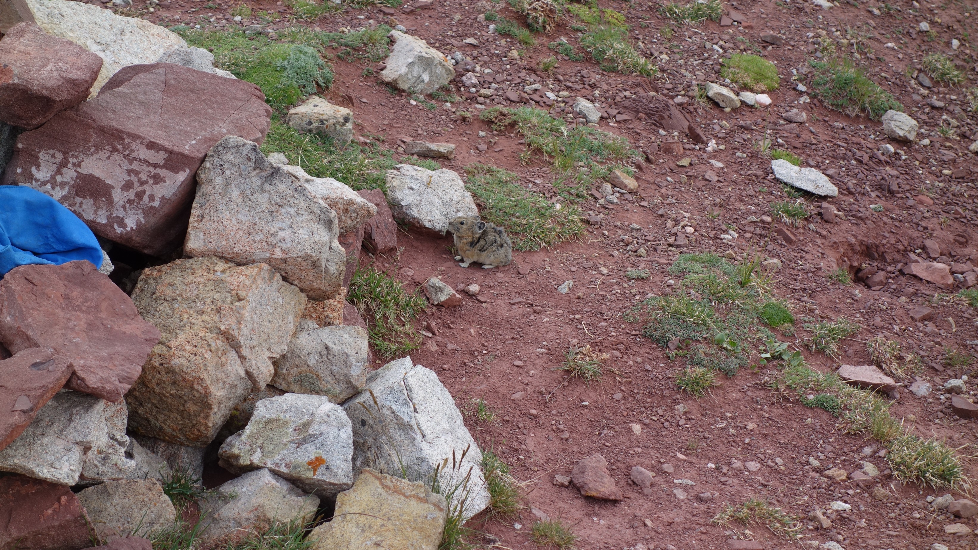 Op de tweede col duikt een pika weg in het steenmannetje. De Nederlandse benaming is Noord-Amerikaanse fluithaas. Ze zien eruit als een hamster maar de pika’s zijn verwant met de familie van konijnen en hazen, al zijn ze met hun 16 à 22 cm lengte wel een stuk kleiner.