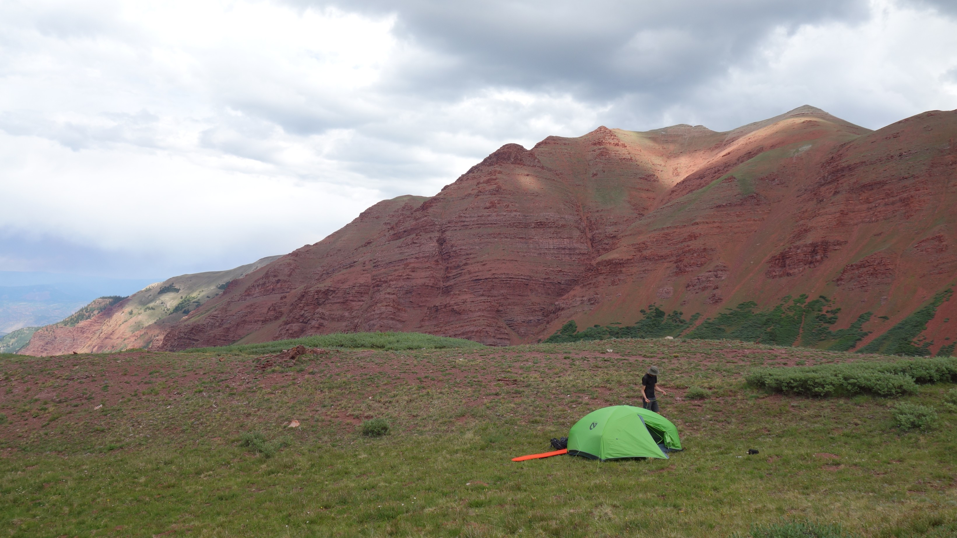 Vanaf de bergpas, starten we aan een lange traverse van de flank om onze tent nabij een naamloos meertje op te slaan. Als de avondzon, na een erg kletterend onweer, de schijnwerpers zet op de rode bergen rondom, is het genieten.