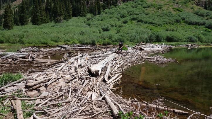 Opgelucht halen we adem als we de vallei bereiken. Het is al middag en er staat ons nog heel wat te wachten. De komende paar uur doen we even terug ‘normaal’ en volgen een mooie trail naar Snowmass Lake. Enkel de natuurlijke brug van dode boomstammen over de afwatering van een bergmeer zorgt voor wat uitdaging.