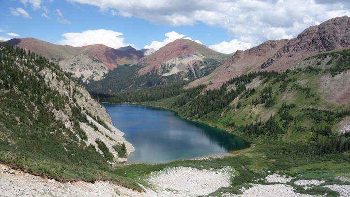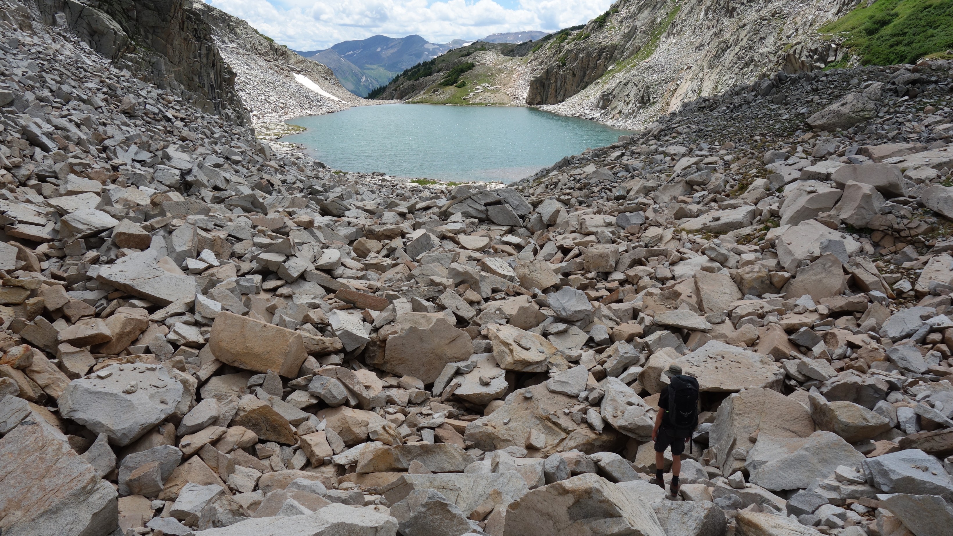 Er zit nog wat jus in de benen dus blikken we vooruit naar Heckert Pass, of tenminste de bergpas net ten westen ervan. De eerste kilometers volgen we de route richting Snowmass Peak die zuidelijk van het meer loopt om dan recht omhoog over een blokkenveld te klimmen. Het is alweer puffen en blazen. Al zijn we al bijna 2 weken in de Rockies op stap, helemaal aangepast aan de grote hoogte ben ik nog niet. Van zodra we de 4.000 meter naderen, schakelt de ademhaling een versnelling hoger en gaat het toch allemaal een pak moeizamer. Het zicht op Snowmass Lake en de kleurrijke bergen rondom is de gewaardeerde beloning.