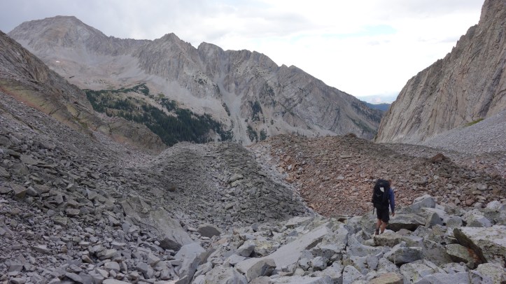 Offtrail trekken we verder ten noorden van Precarious Peak. Geen idee of de route haalbaar zal zijn want de ondergrond is hier erg brokkelig. Alles verloopt voorspoedig en we geraken zonder veel moeite op de trail richting East Maroon Pass. Die laten we echter links liggen om de weinig belopen trail naar de Copper Pass te lopen.