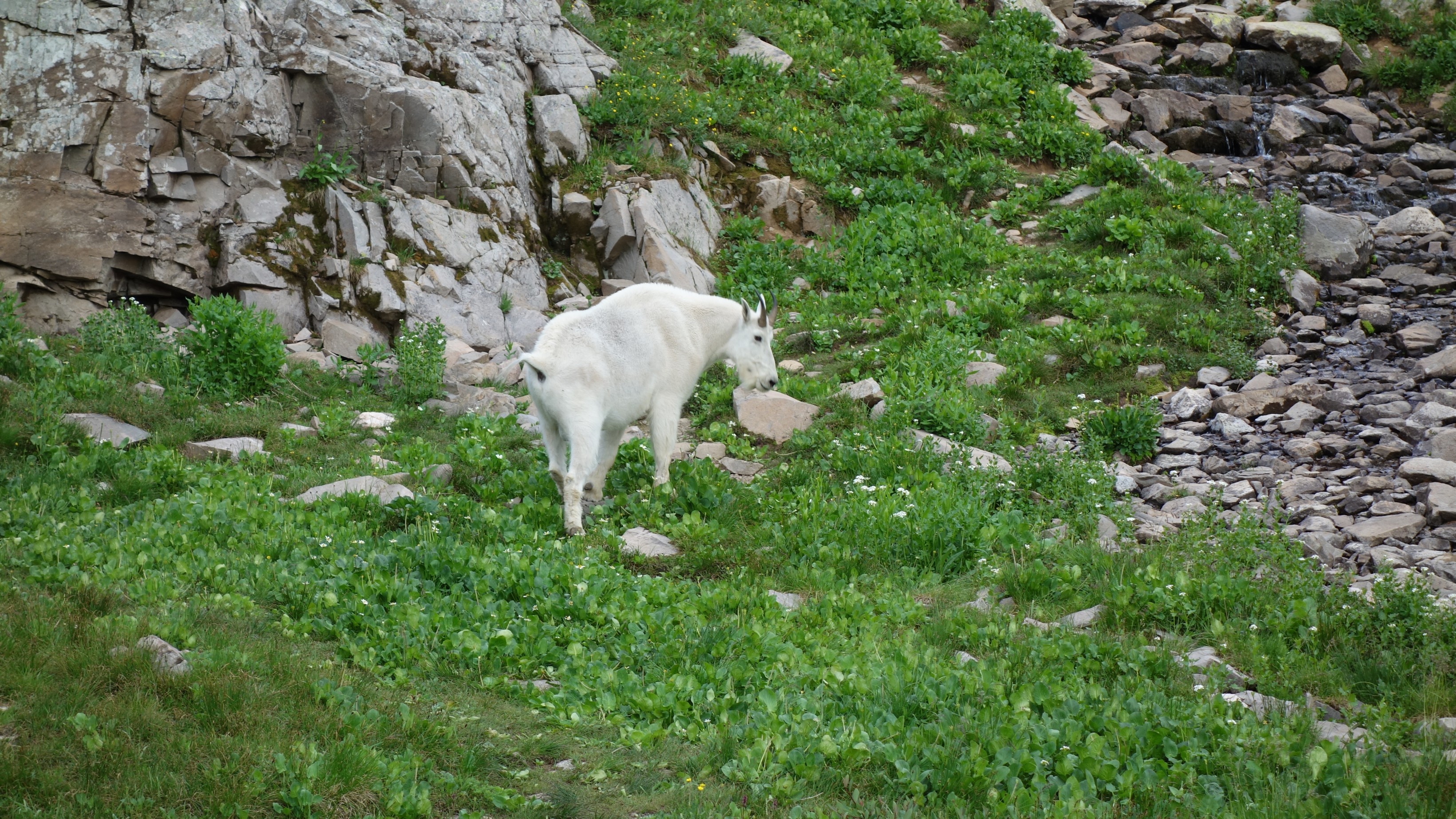 Bij Capital Lake installeren we ons op één van de voorziene bivakzones. Wat verder graast een mountain goat. Deze harige witte sneeuwgeit met zijn korte hoorntjes ziet er qua gestalte toch vrij imposant uit en we blijven op een veilige afstand. Ondanks zijn naam is het dier nauwer verwant aan de gems dan aan de geit. Hij klimt dan ook meer dan behoorlijk in sneeuw, ijs en steile rotsen en durft zich in de zomer tot op 4.000 meter hoogte te begeven.