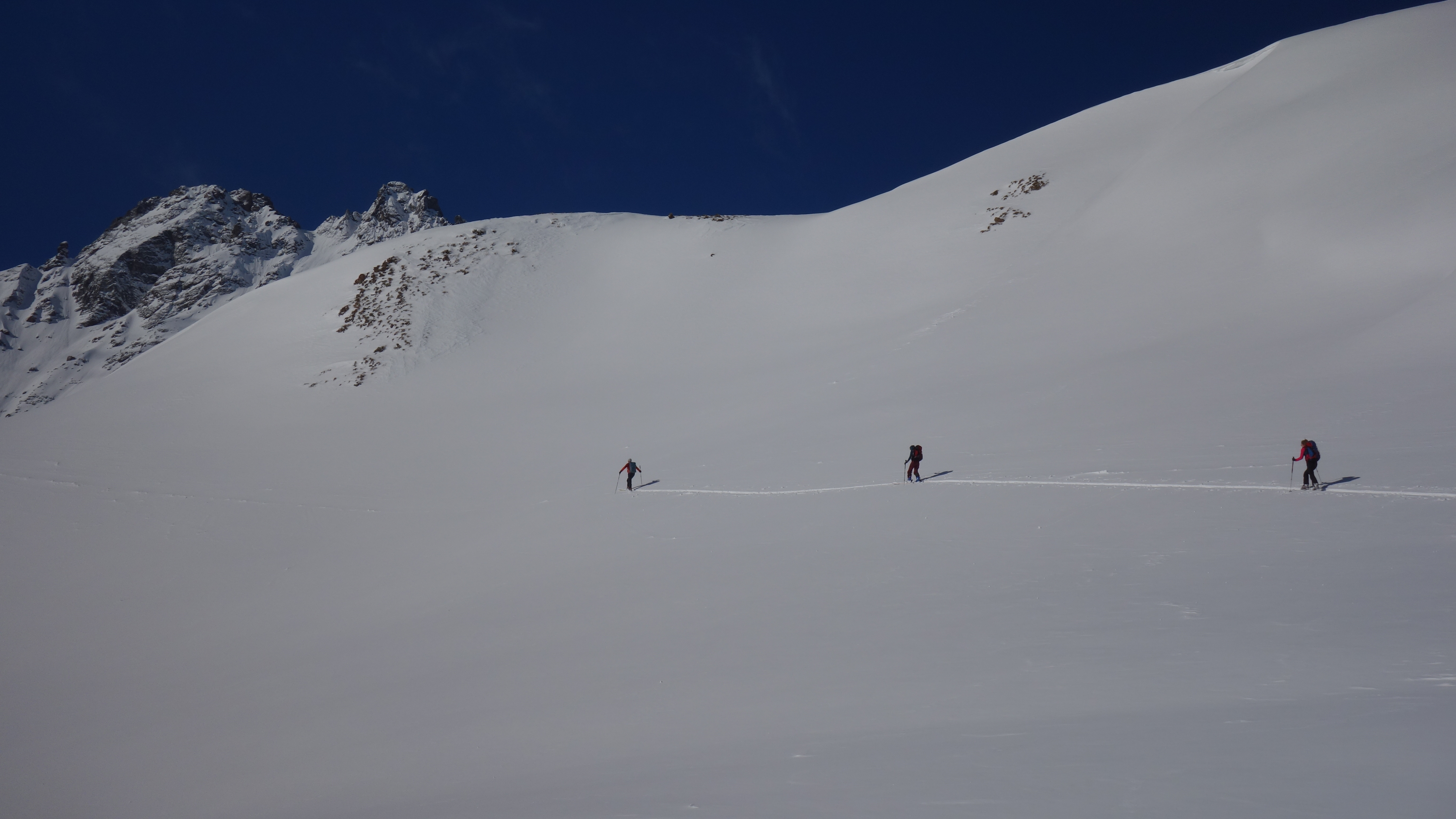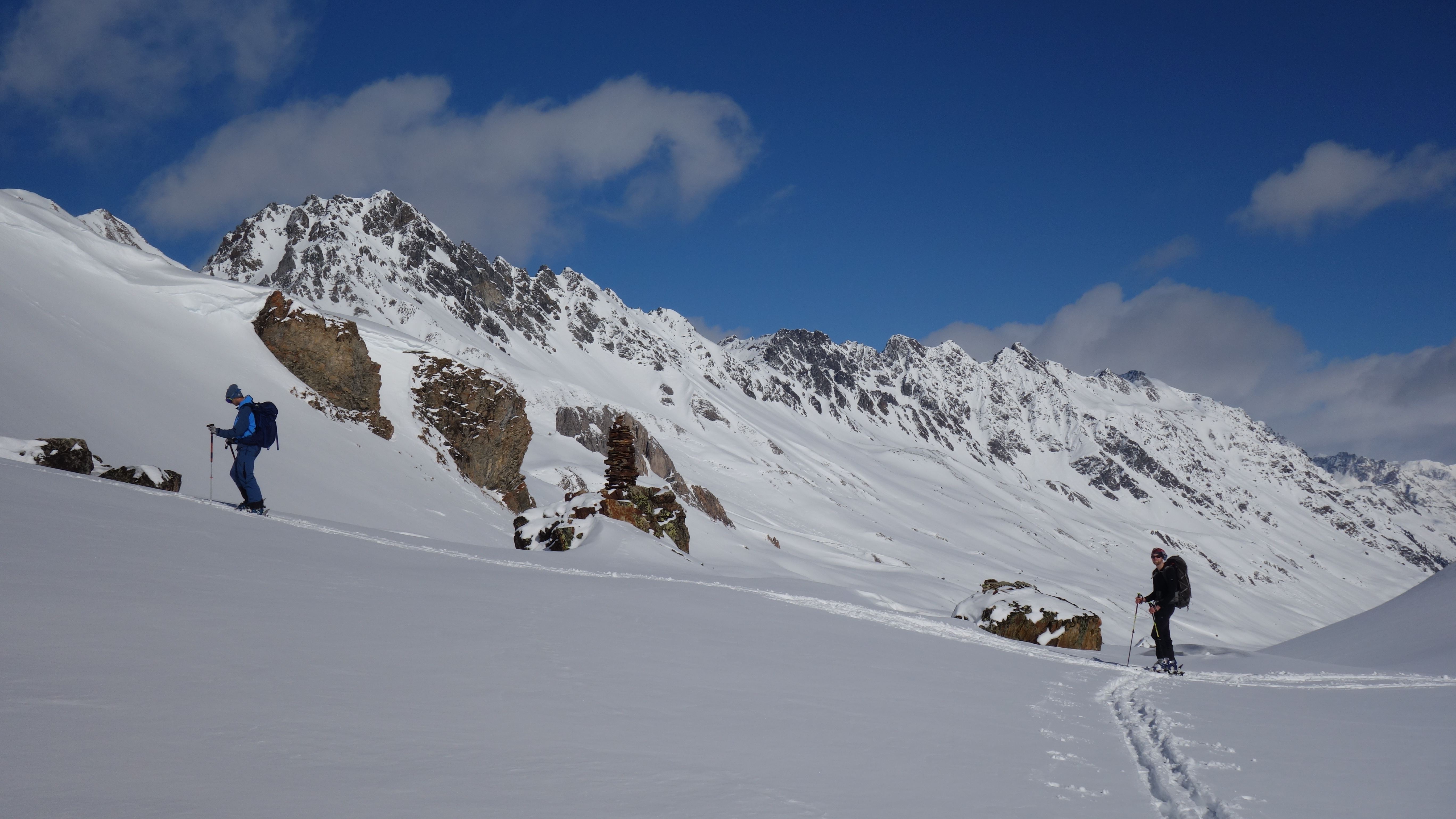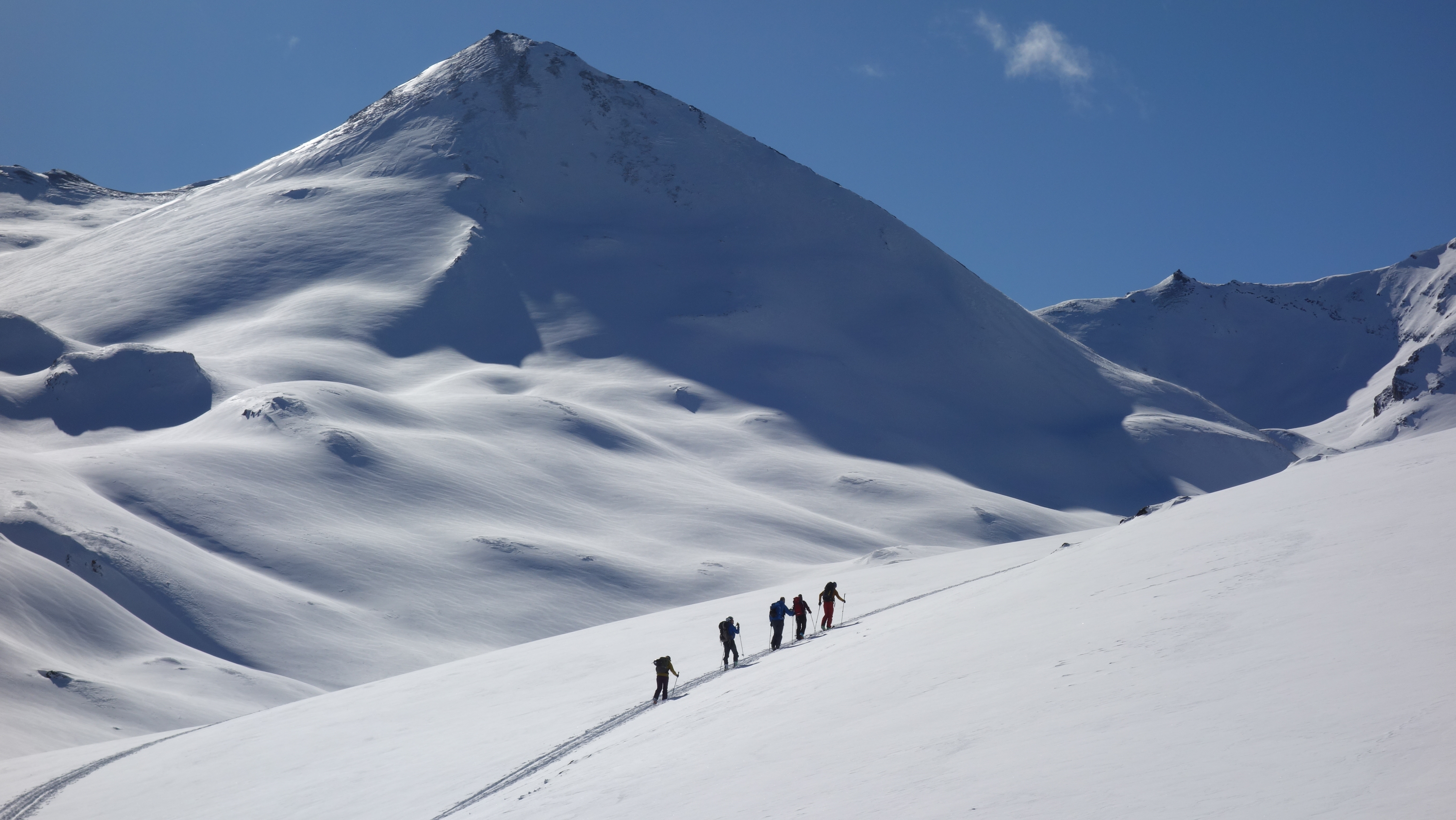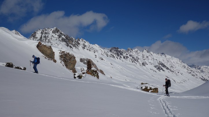 Voor wie het in Keulen hoort donderen, in de Alpen zijn toerski’s de populairste manier om in de bergen buiten de skigebieden op stap te gaan. Synthetische behaarde vellen onderaan de ski’s zorgen ervoor dat je niet naar beneden glijdt als je naar een col aan het klimmen bent. De hiel van je skibot zit los en via een glijbeweging schuif je omhoog (wat vergelijkbaar met het langlaufen in een loipe). Als het steil wordt, dan wordt er ‘gespitzkehrt’ (gezigzagd dus). Ofwel maak je je eigen spoor in de sneeuw, ofwel volg je dat van een andere skiër als je een beetje luier bent. Eenmaal boven haal je de vellen eraf, klik je je botten vast en ski je (al dan niet vlot) naar beneden. Daarbij hangt de beleving af van het type sneeuw dat je tegenkomt. Verse poeder is het meest geliefd, harde verijsde sneeuw een pak minder.
