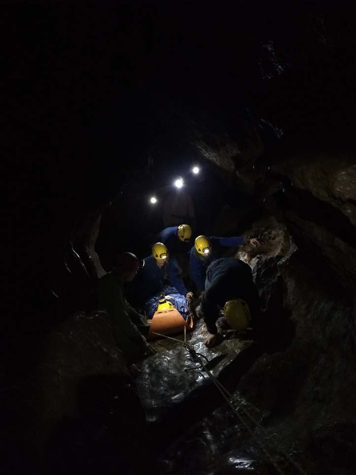 Daarnaast is er ook een grotere oefening in een grot. Zelf nam ik de rol van coördinator van een reddingsteam op. We moesten een groepje van 3 speleologen terugvinden. Via smalle en soms glibberige gangen dalen we af en vinden het drietal terug. Eén slachtoffer is er erg aan toe, krijgt reanimatie maar moeten we uiteindelijk dood verklaren. Een ander slachtoffer heeft een gebroken femur, wordt gespalkt en moet geëvacueerd worden. De derde persoon krijgt mentale bijstand. Een evacuatie onder de grond vraagt een hele organisatie met degelijke stabilisatie in de slede, een takelsysteem en de nodige man- en vrouwkracht om het slachtoffer terug omhoog te krijgen.