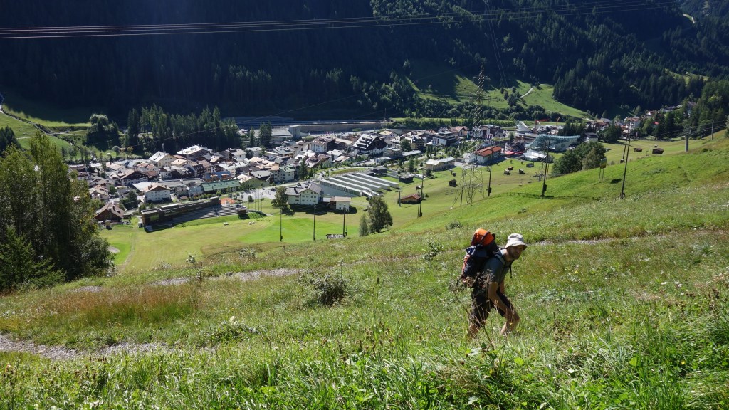 Mijn kaartleescapaciteiten zitten duidelijk onder een laag stof. Dat komt ervan om enkel nog met de koersfiets rond te rijden. We zijn Sankt Anton nog niet uit of ’t is al zoeken naar het wandelpad. De talloze skipistes in hun zomerse outfit brengen me in de war. Aan de Rodelhütte zitten we terug op het goede spoor.