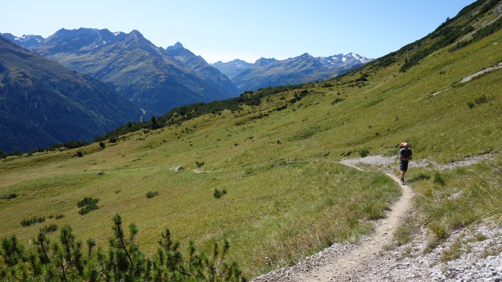 Laat je de klim naar de Stanskogel achterwege, dan is de afstand 11km met 1.335m stijgen en 323m dalen.