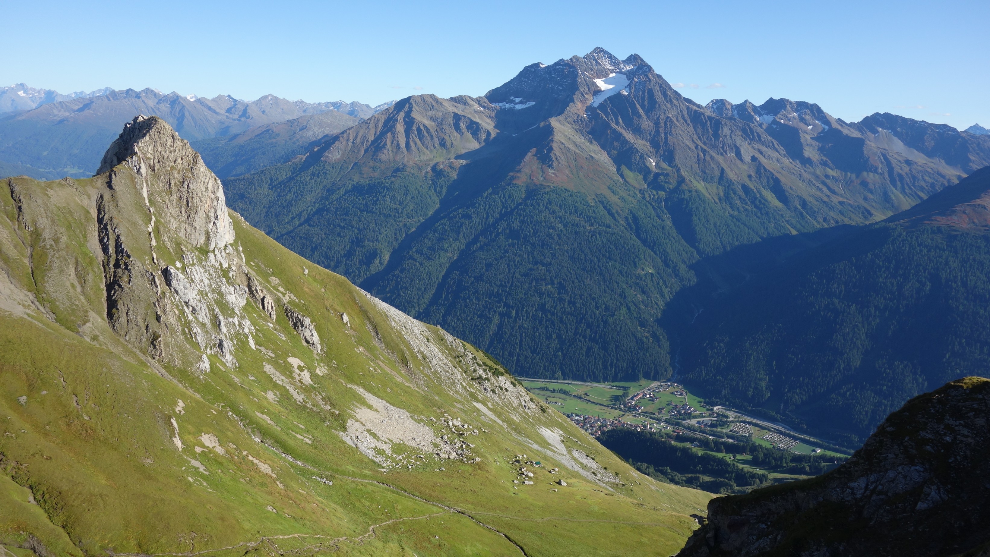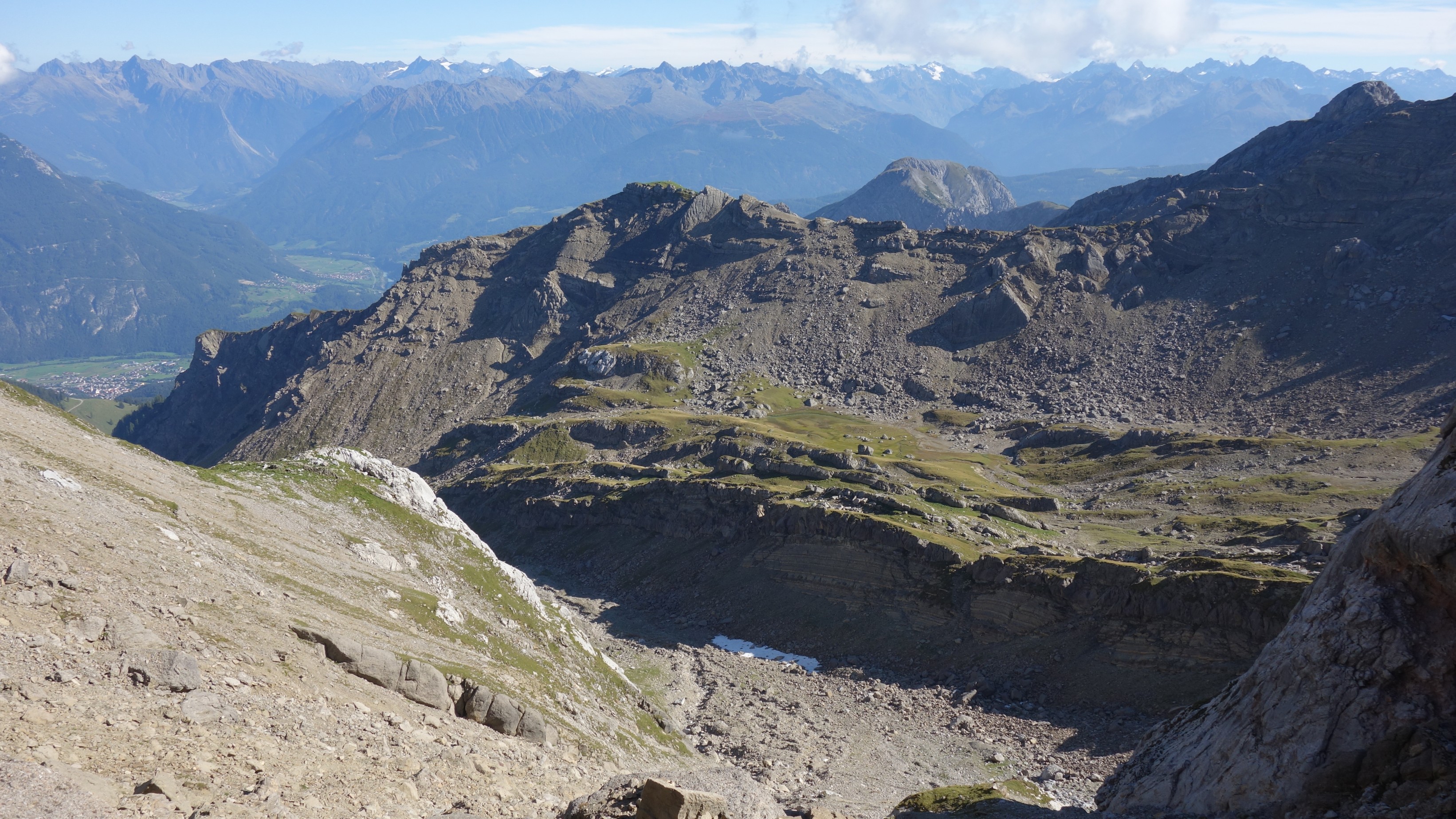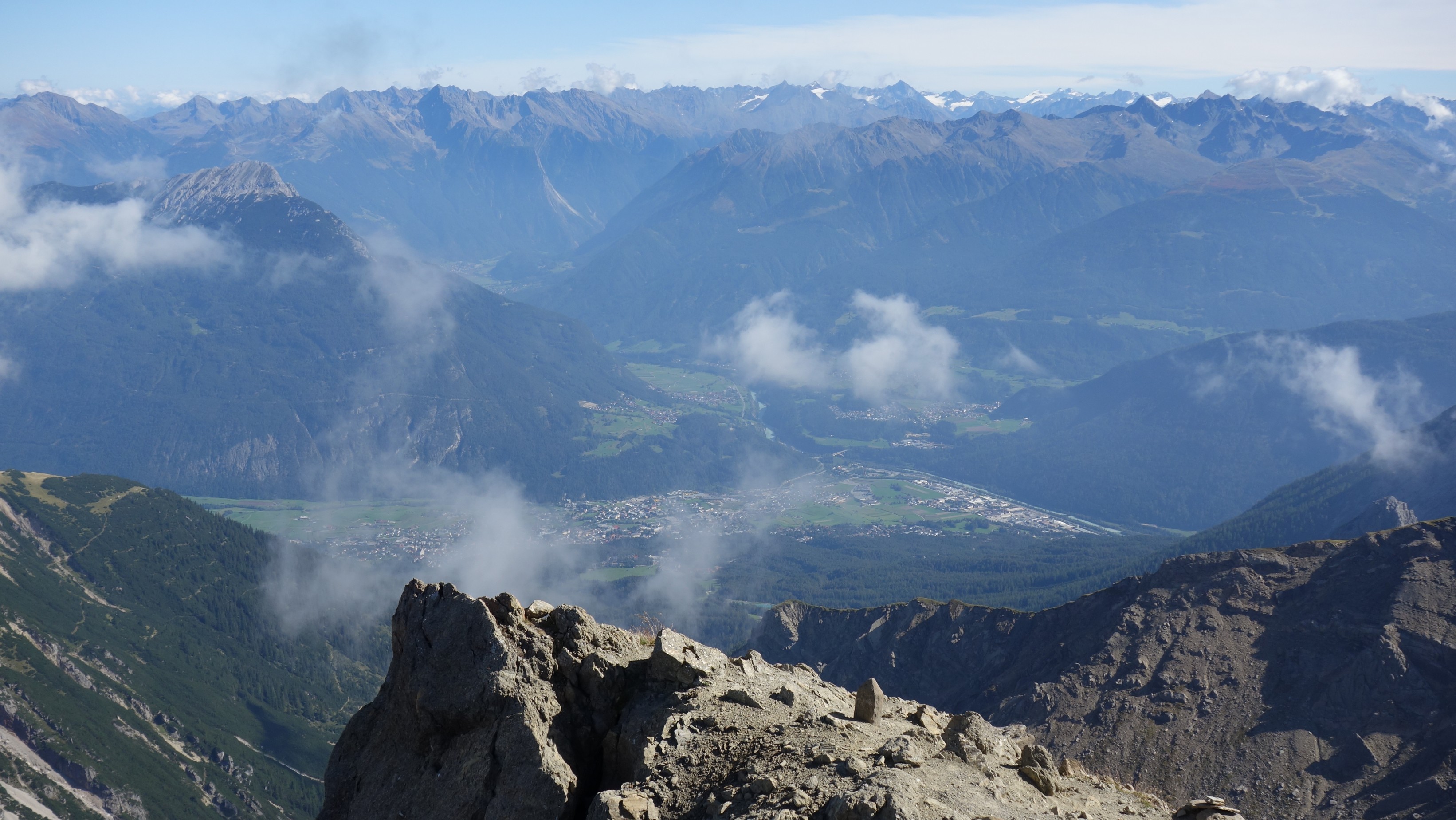 De Muttekopf is de kers op de taart. Vandaar blikken we terug op onze route maar zien we ook Imst al liggen.