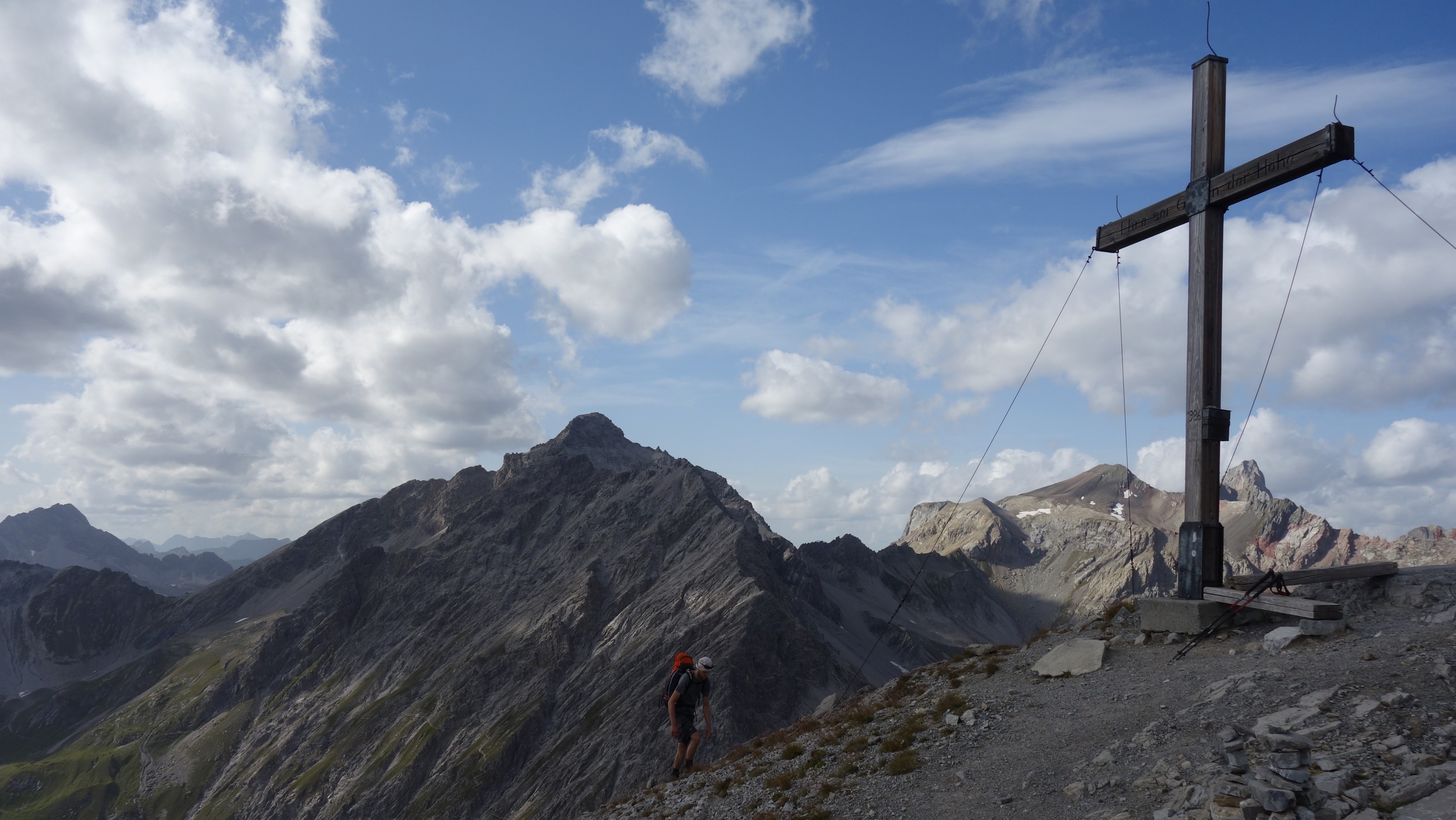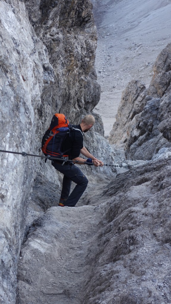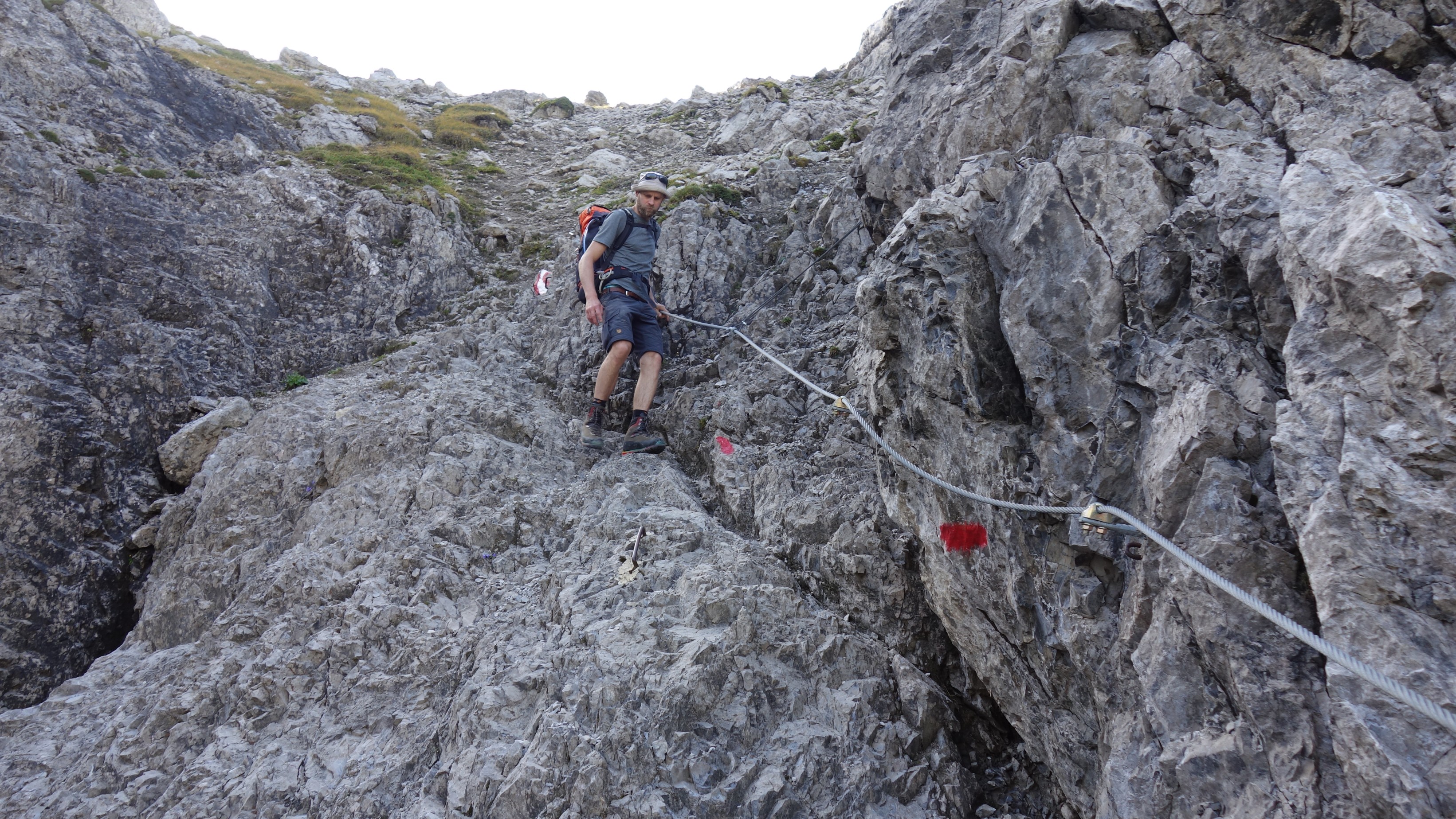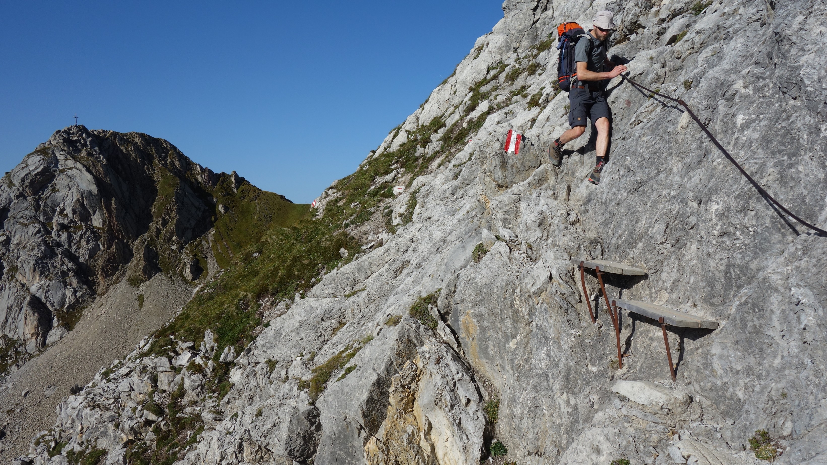 We gaan op ons elan verder en gaan voor 3 bergtopjes vandaag. De Grießkopf komt er al snel aan. Daarna loopt de route langs de steile flank verder, rotswanden worden overwonnen met stapjes en kabels. Not for the faint hearted.