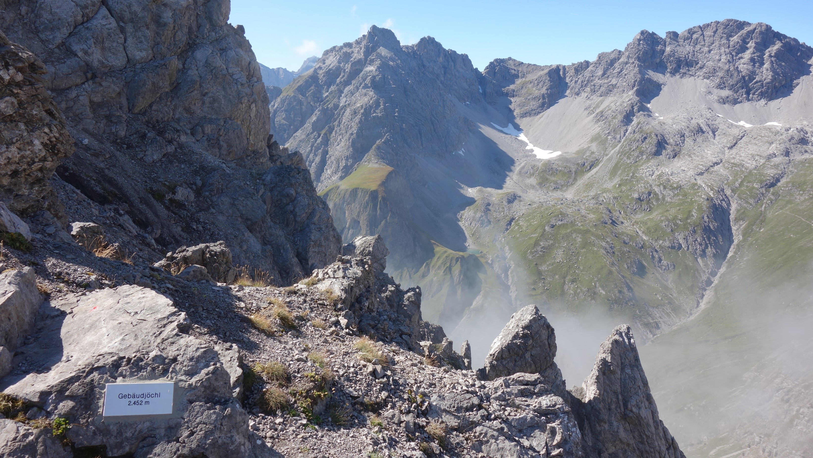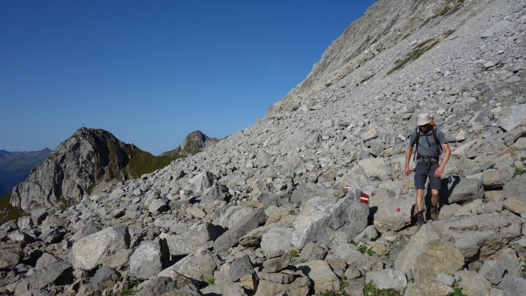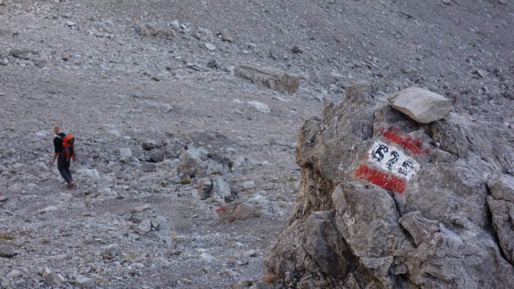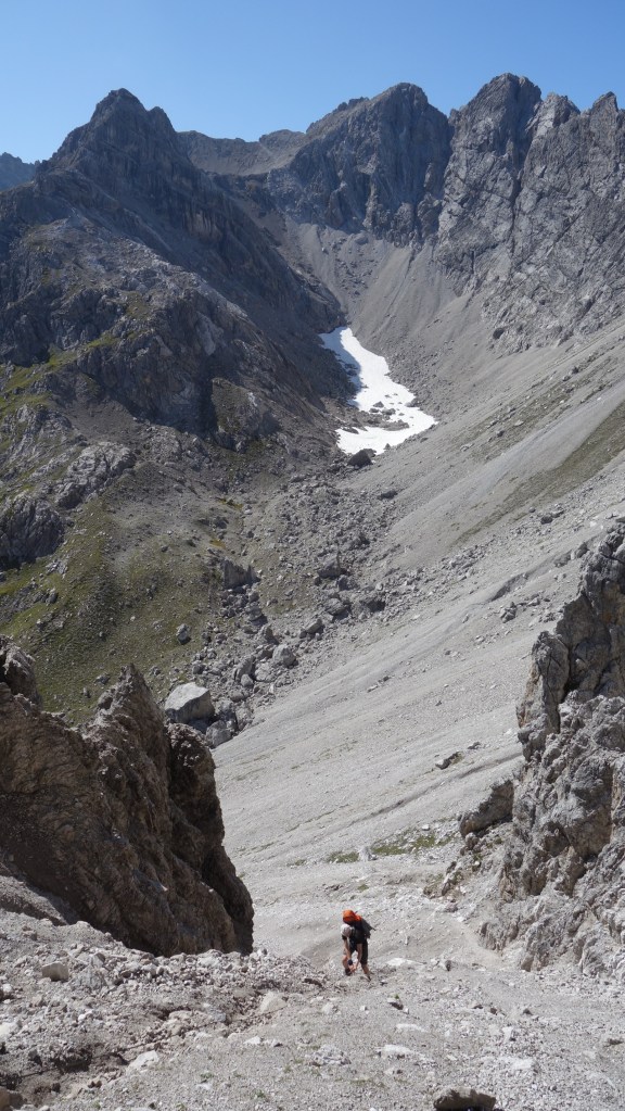 Op weg naar de Seescharte halen we de ene na de andere bergwandelaar in, wat niet altijd evident is gezien het om een langgerekte puinhelling gaat. Blijkbaar zijn we op een heel populaire noord-zuid-route terechtgekomen.