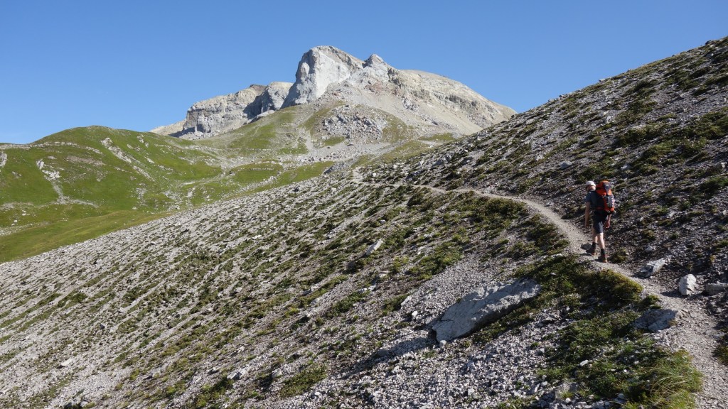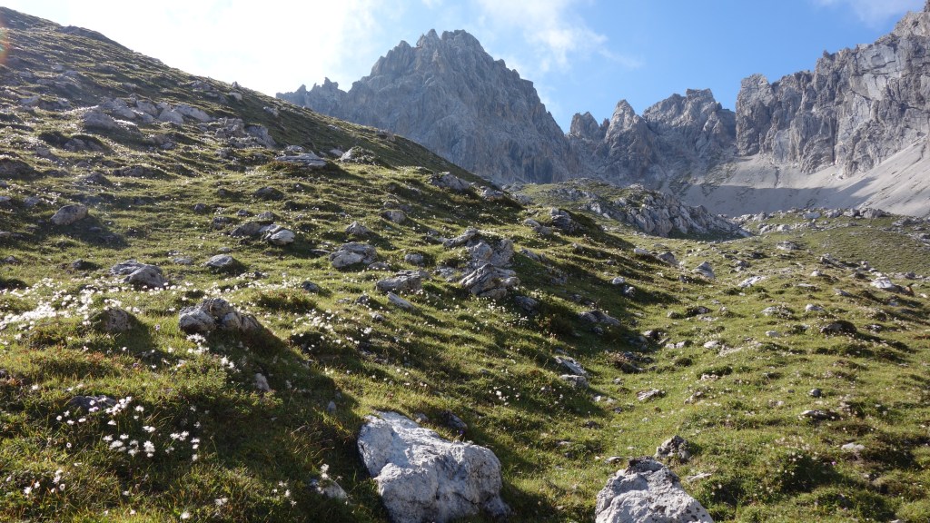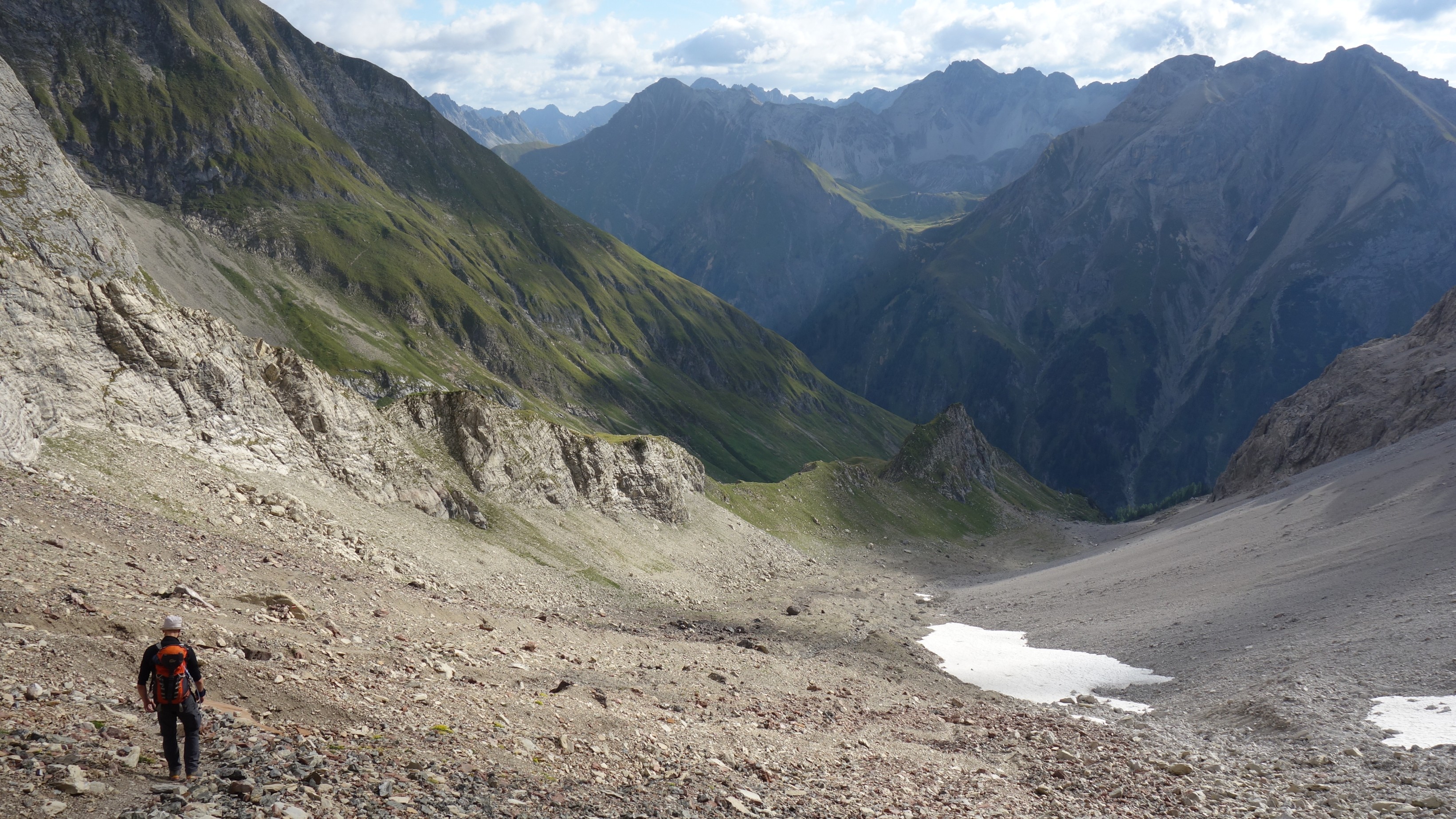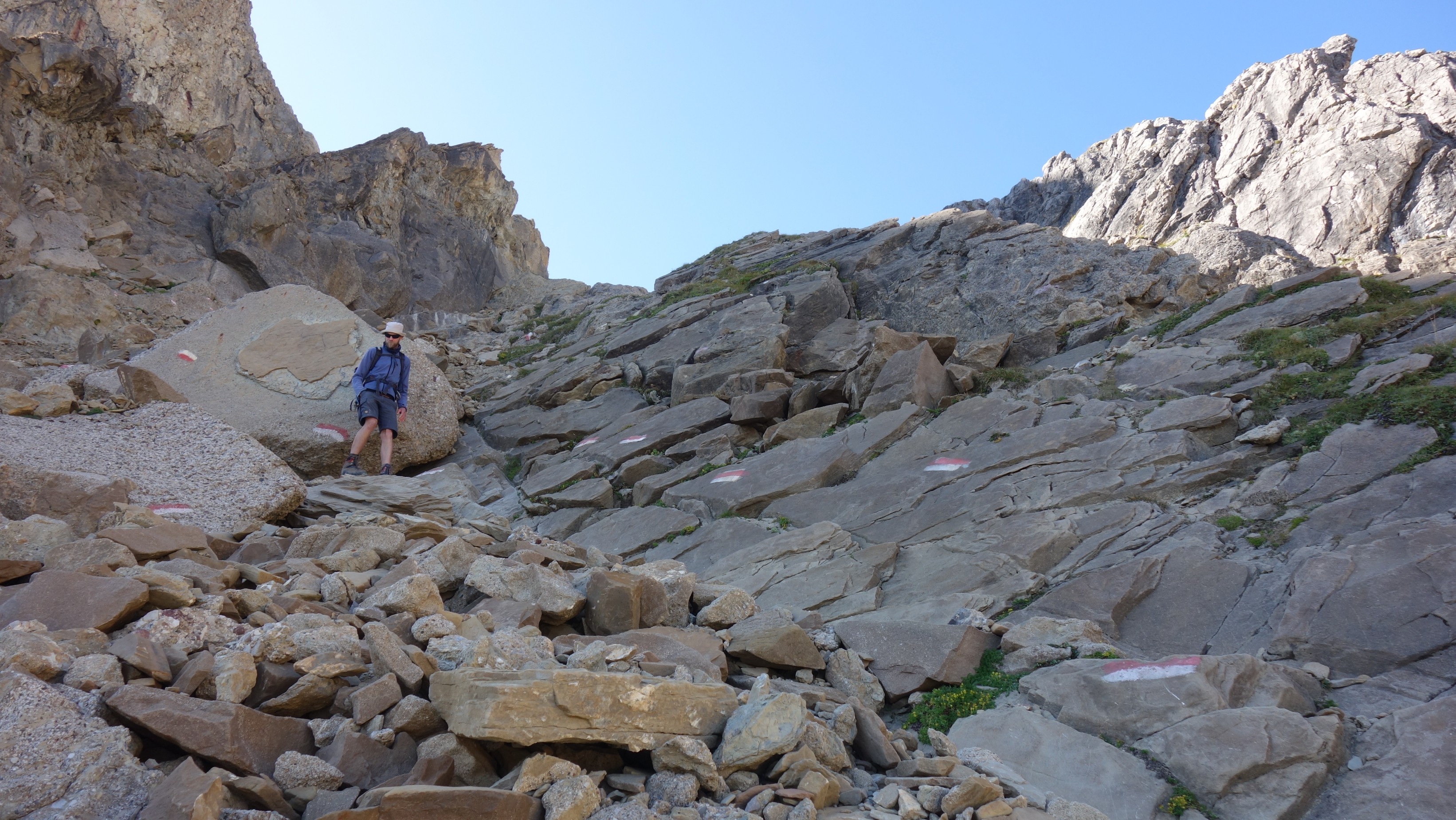 Op weg naar de Seescharte halen we de ene na de andere bergwandelaar in, wat niet altijd evident is gezien het om een langgerekte puinhelling gaat. Blijkbaar zijn we op een heel populaire noord-zuid-route terechtgekomen.