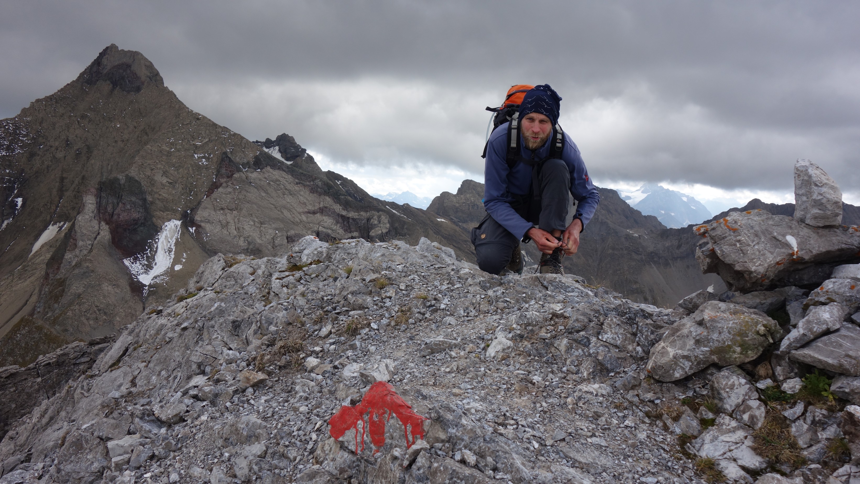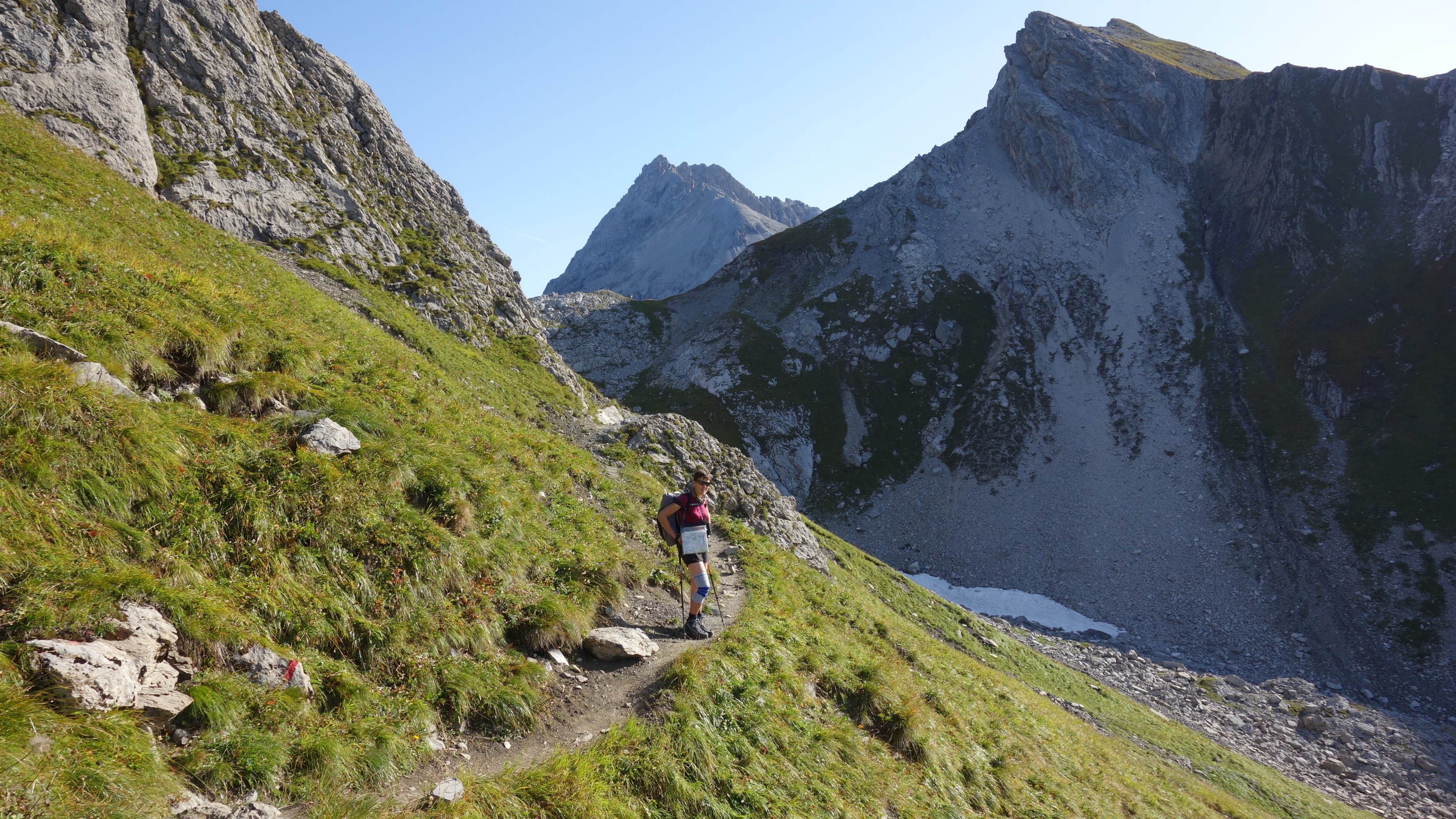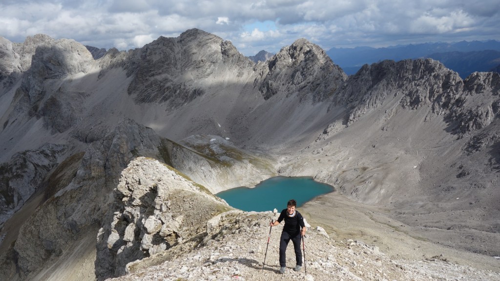 Een frisse wind vandaag en ook de wolken zijn present. Het terrein wordt steeds technischer, zeker de afdaling van de Grießlscharte vraagt de nodige focus. We vragen ons af of de man die we daarnet op sandalen en met waterdichte zakken in beide handen passeerden hier veilig gaat door geraken. Sporadisch kom je in de bergen zonderlinge figuren tegen.