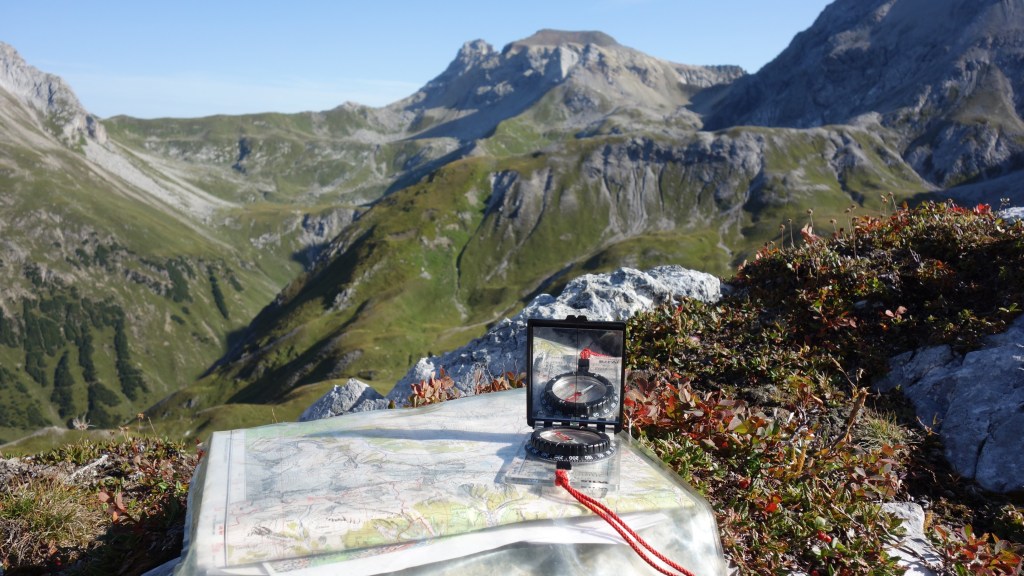 Op de Hinterseejoch wijken we af van de Adlerweg voor een extra lusje naar de Feuerspitze. Tijdens een pauze doe ik een poging om Ivo’s kompasvaardigheden op te frissen, maar de interesse is niet bijzonder groot.