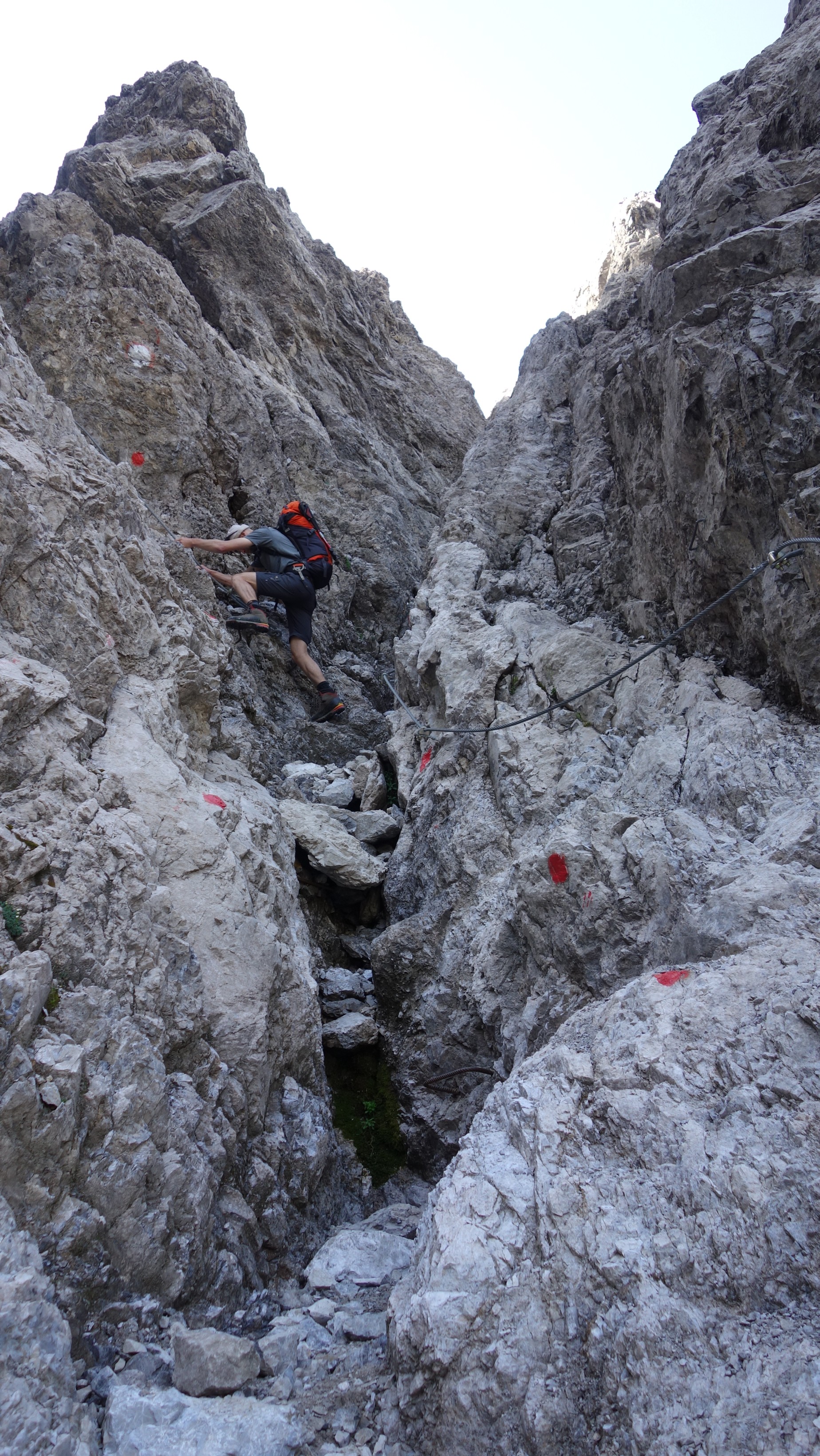 Op de Hintere Dremelscharte zitten we terug boven de wolken. Een touw helpt ons door een couloir terug omlaag.
