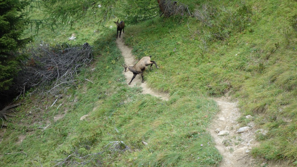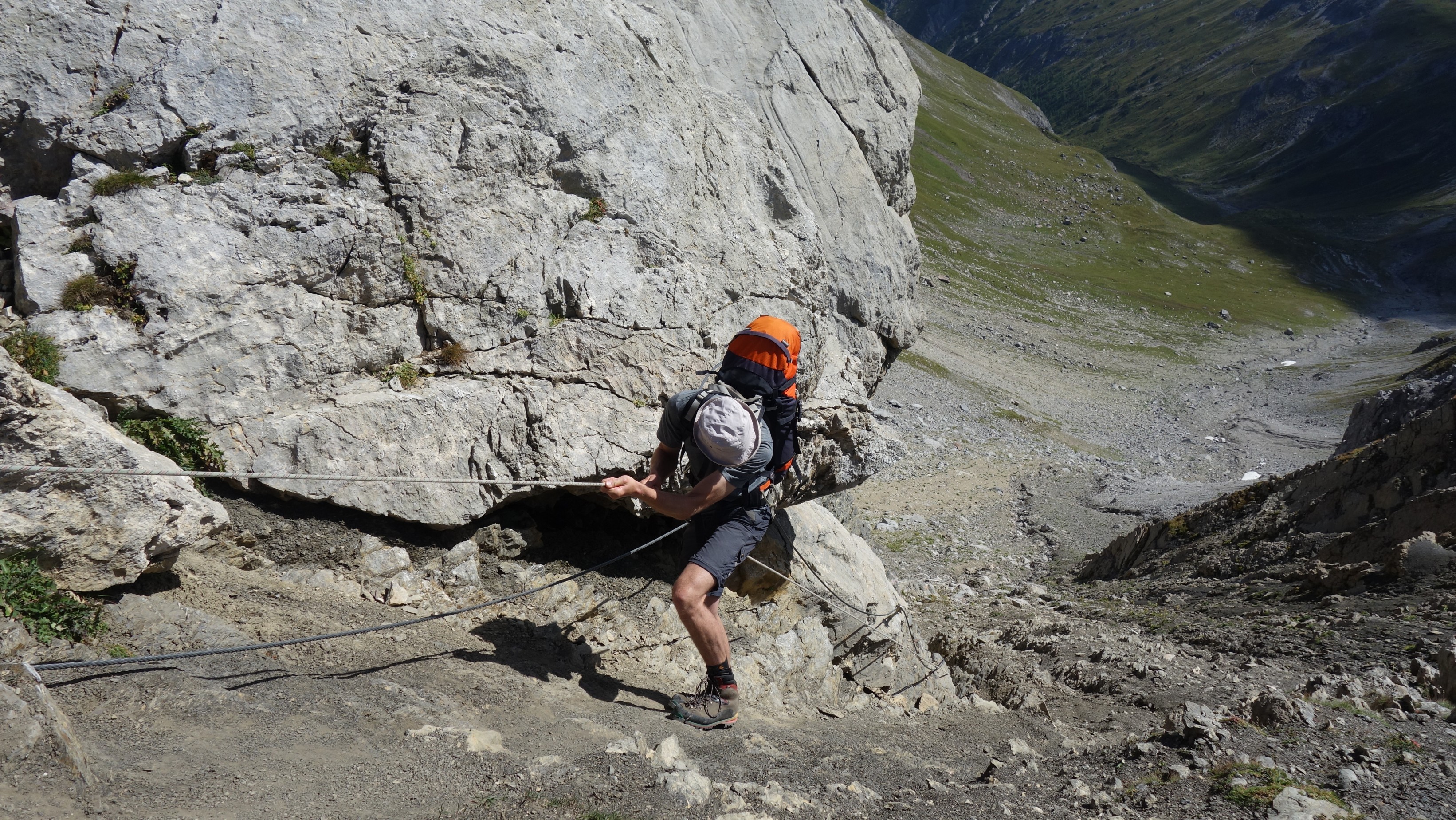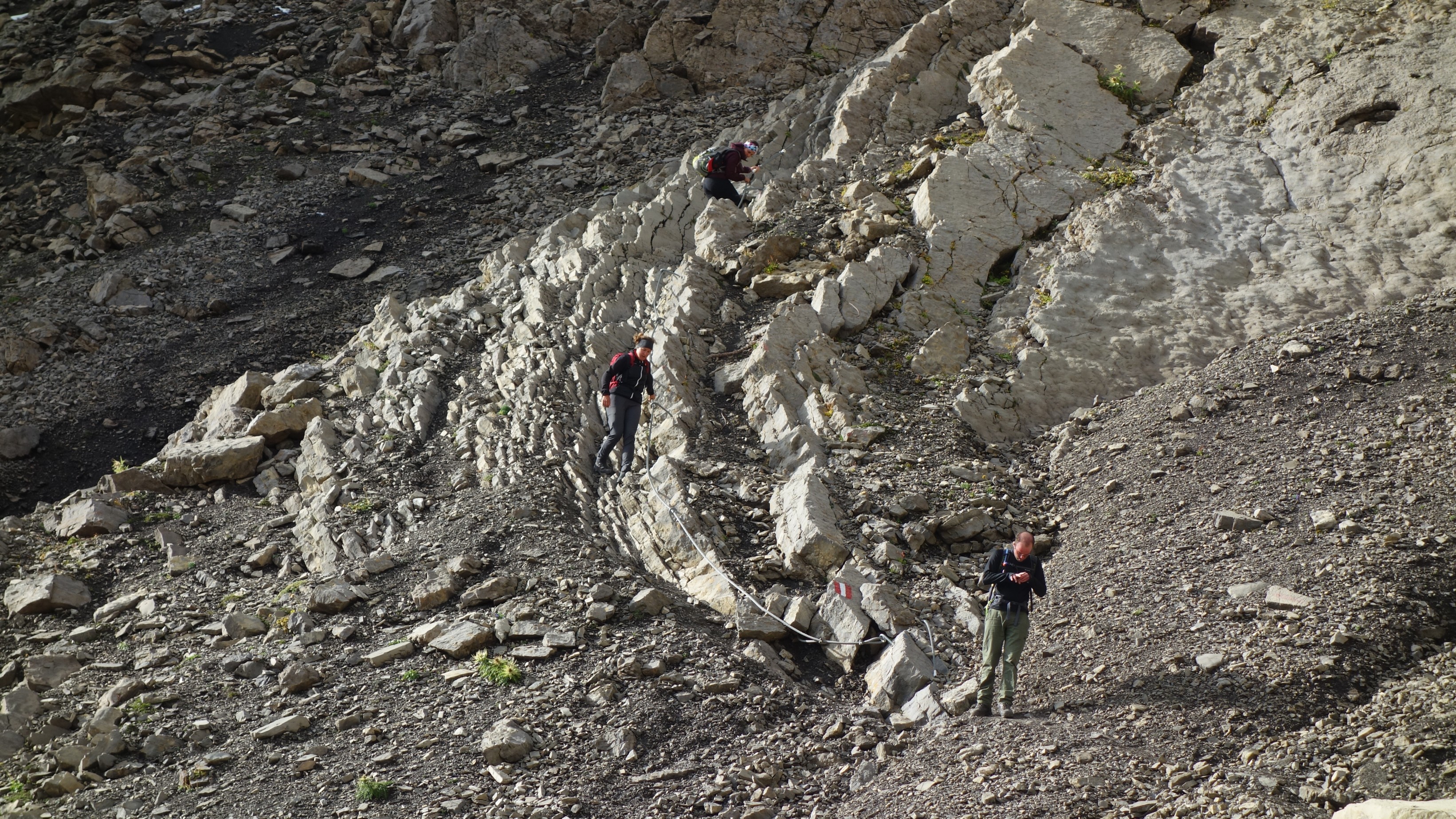 De route wordt technischer en krijgt klettersteigallures. Af en toe worden de wandelstokken doorgegeven om de handen vrij te hebben. Ook de afdaling van de Stierlahnzugjoch is niet simpel. Hangend aan een touw worden de voeten recht op de wand vol los grint gezet om maximale grip te houden. Enkele steenbokken tonen dat het bij hen een pak vlotter gaat en ze al die hulpmiddelen niet nodig hebben.