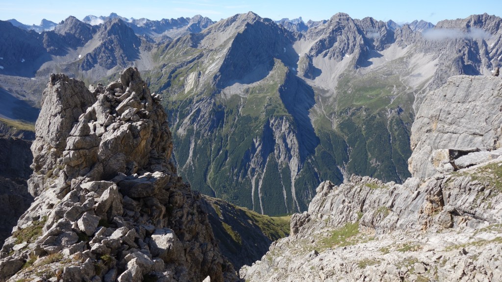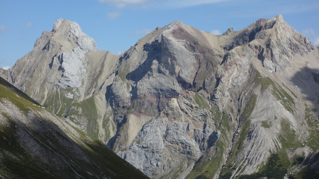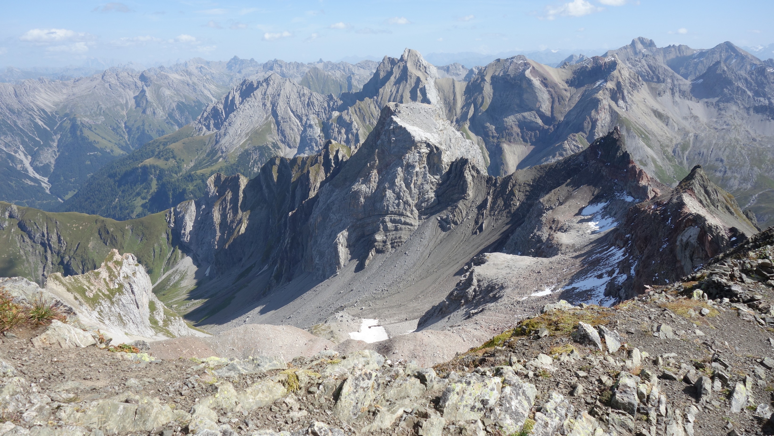 Het panorama op de Feuerspitze is indrukwekkend. Boeiend die grillige vormen en de diverse kleuren van dit woeste kalksteengebergte.